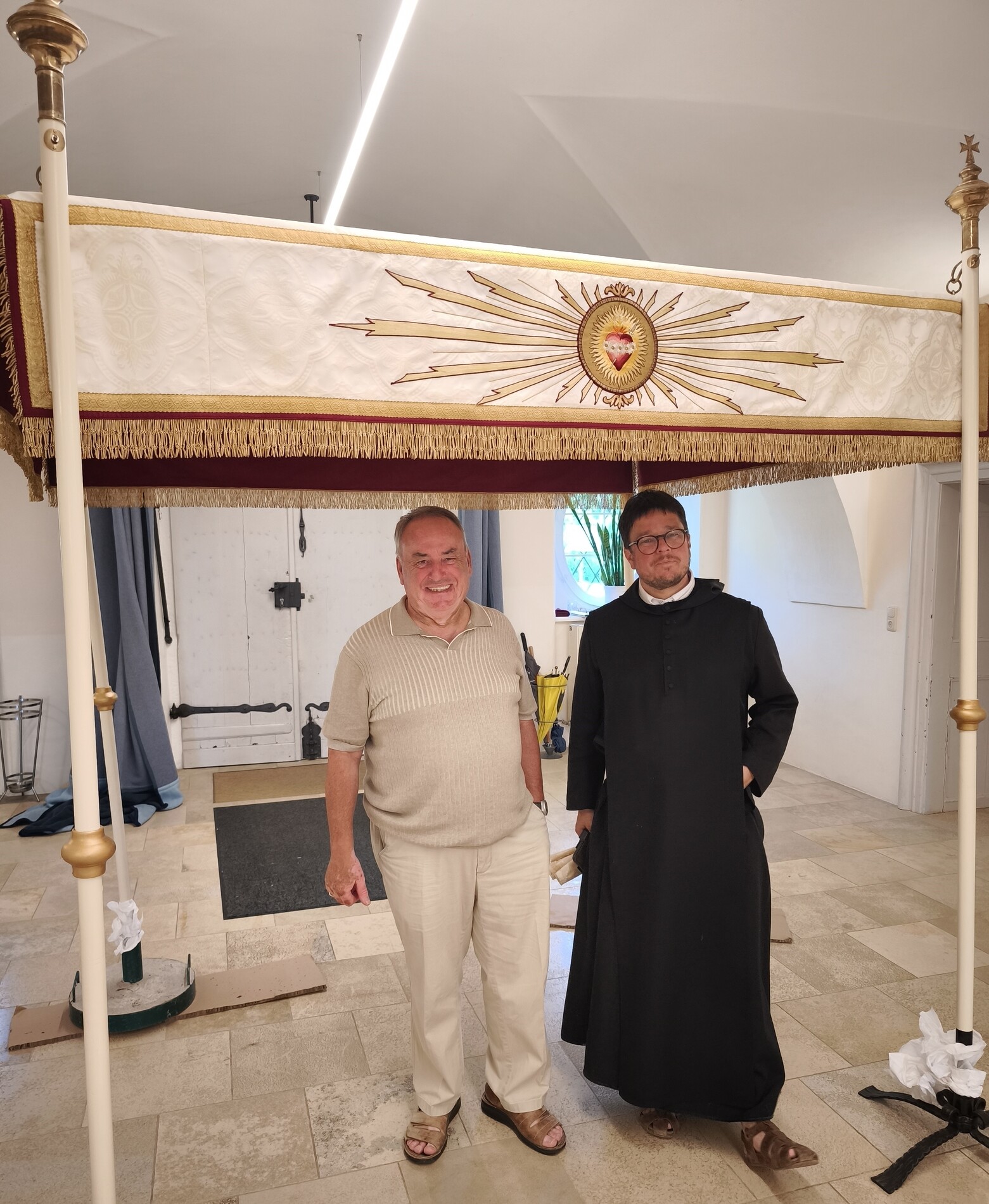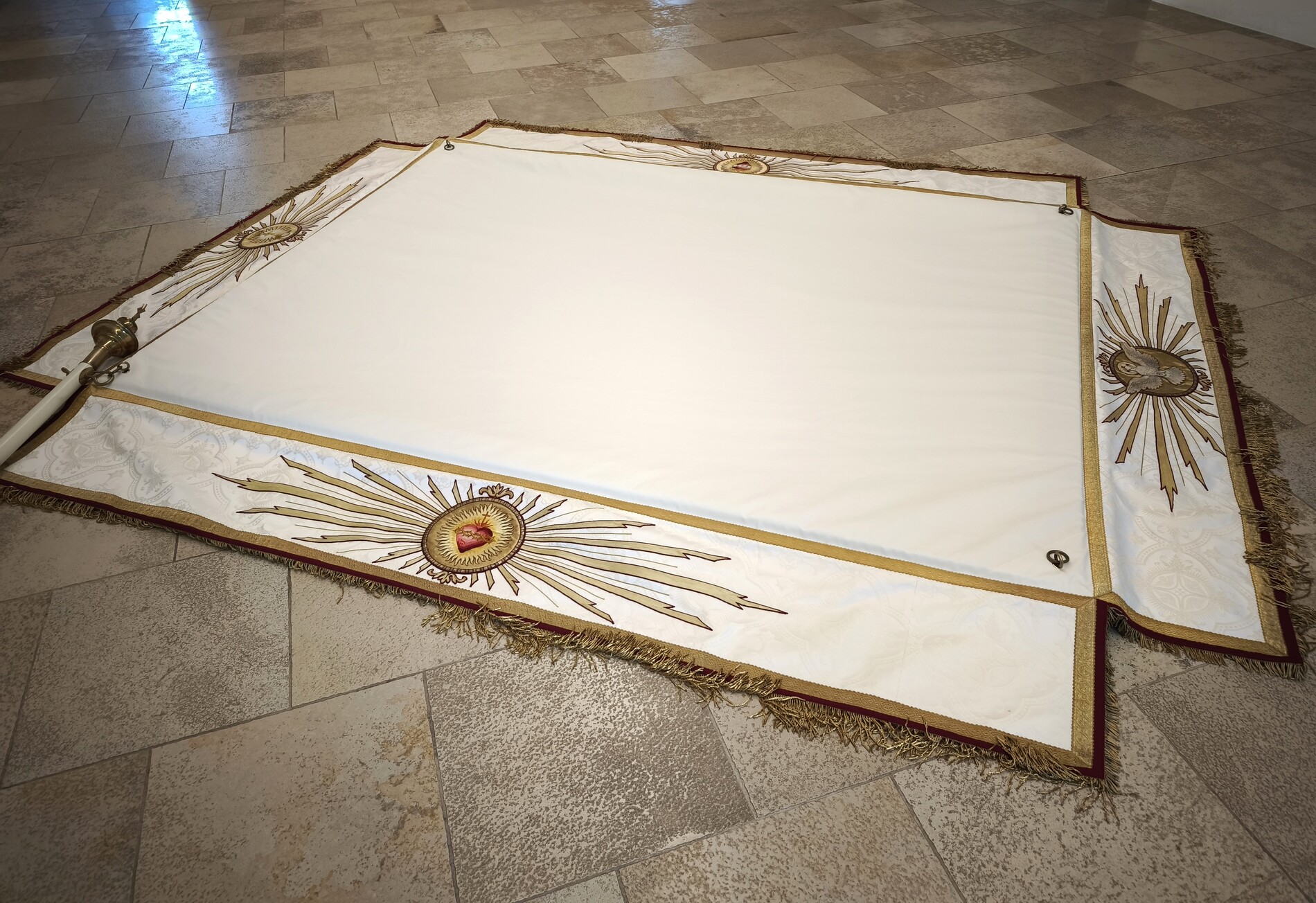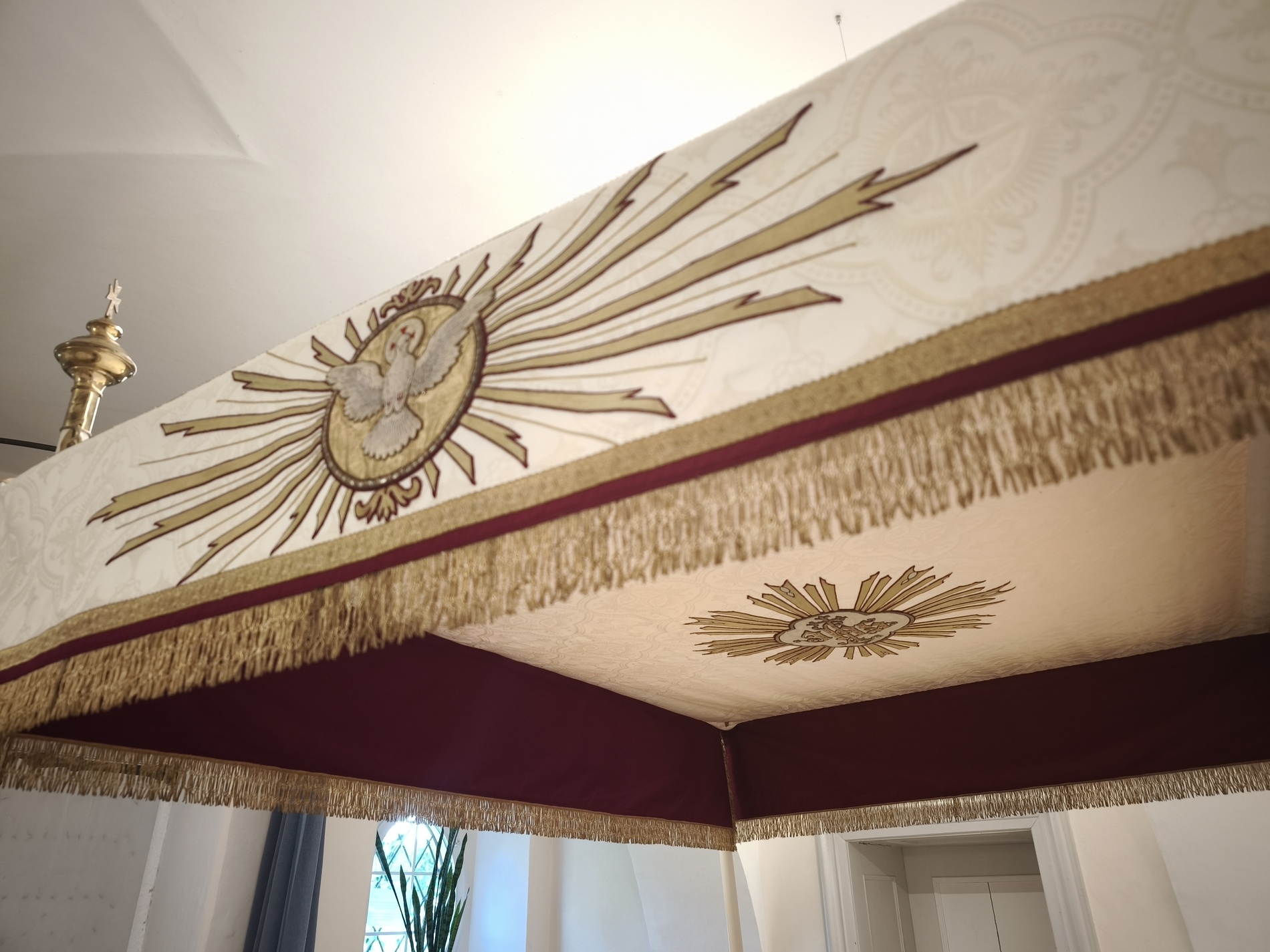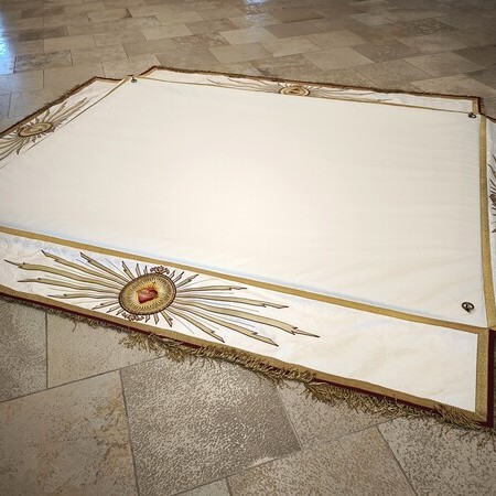 Der Fronleichnams-Baldachin wurde letztes Jahr in die Paramentik der Benediktinerinnen in Steinerkirchen zur notwendig gewordenen Restaurierung gebracht. Rund 80 bis 90 Arbeitsstunden sind für die Restaurierung angefallen, die Stickereien wurden aus dem schadhaften Stoff ausgeschnitten und wieder neu auf Damast aufgenäht.