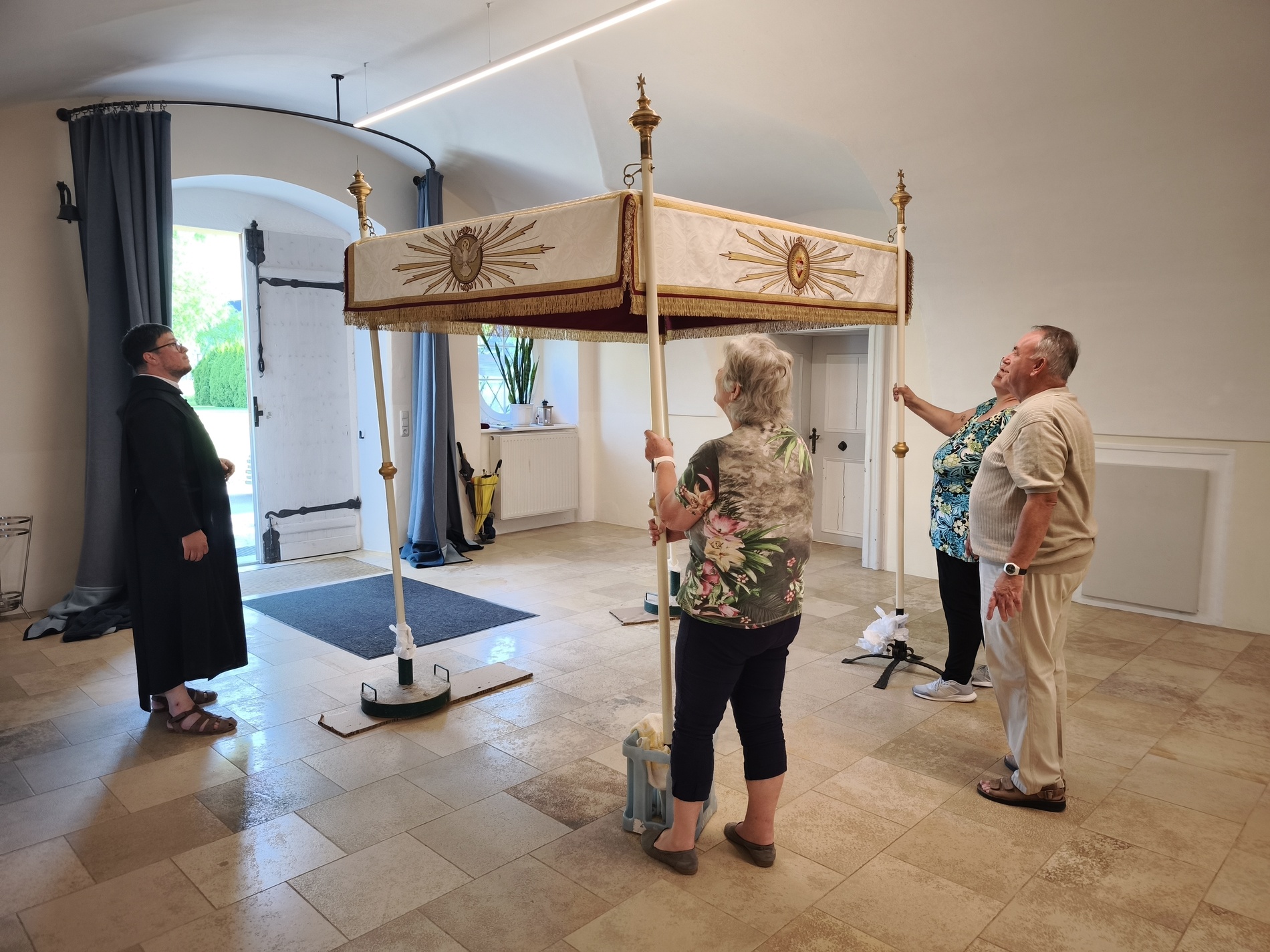 Der Tragehimmel ist seit 95 Jahren in Verwendung und wurde 1930 von P. Adolf Stixenberger angeschafft, Pfarrer in Biberbach von 1924 bis zu seinem Tod 1933. Auszug aus der Pfarrchronik von 1930: