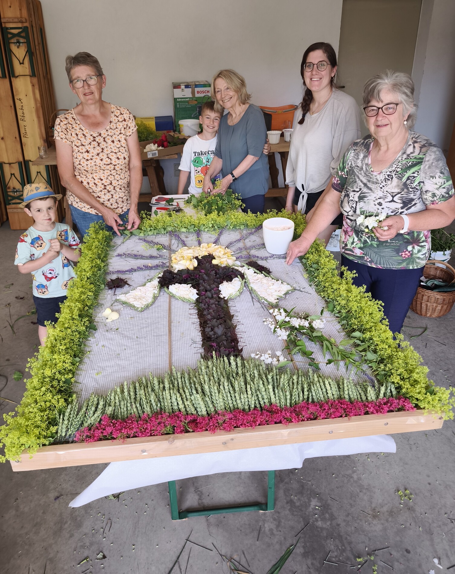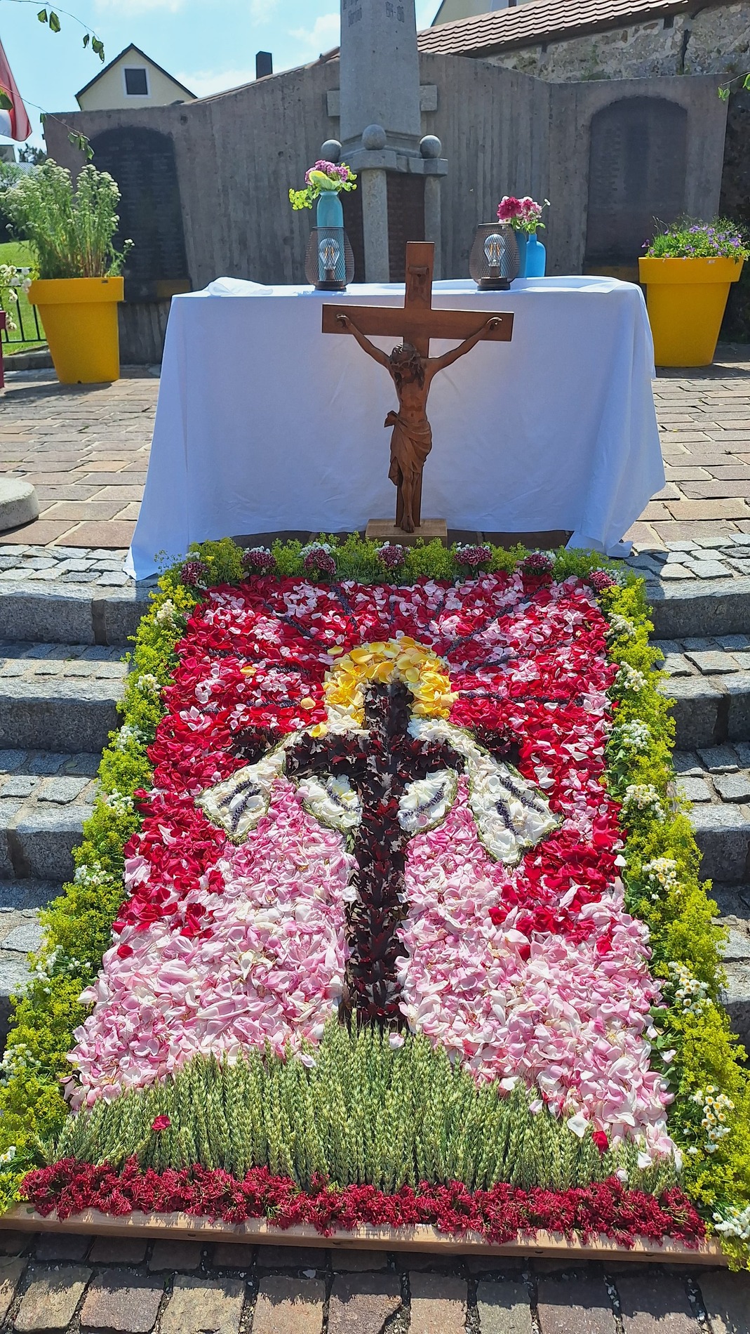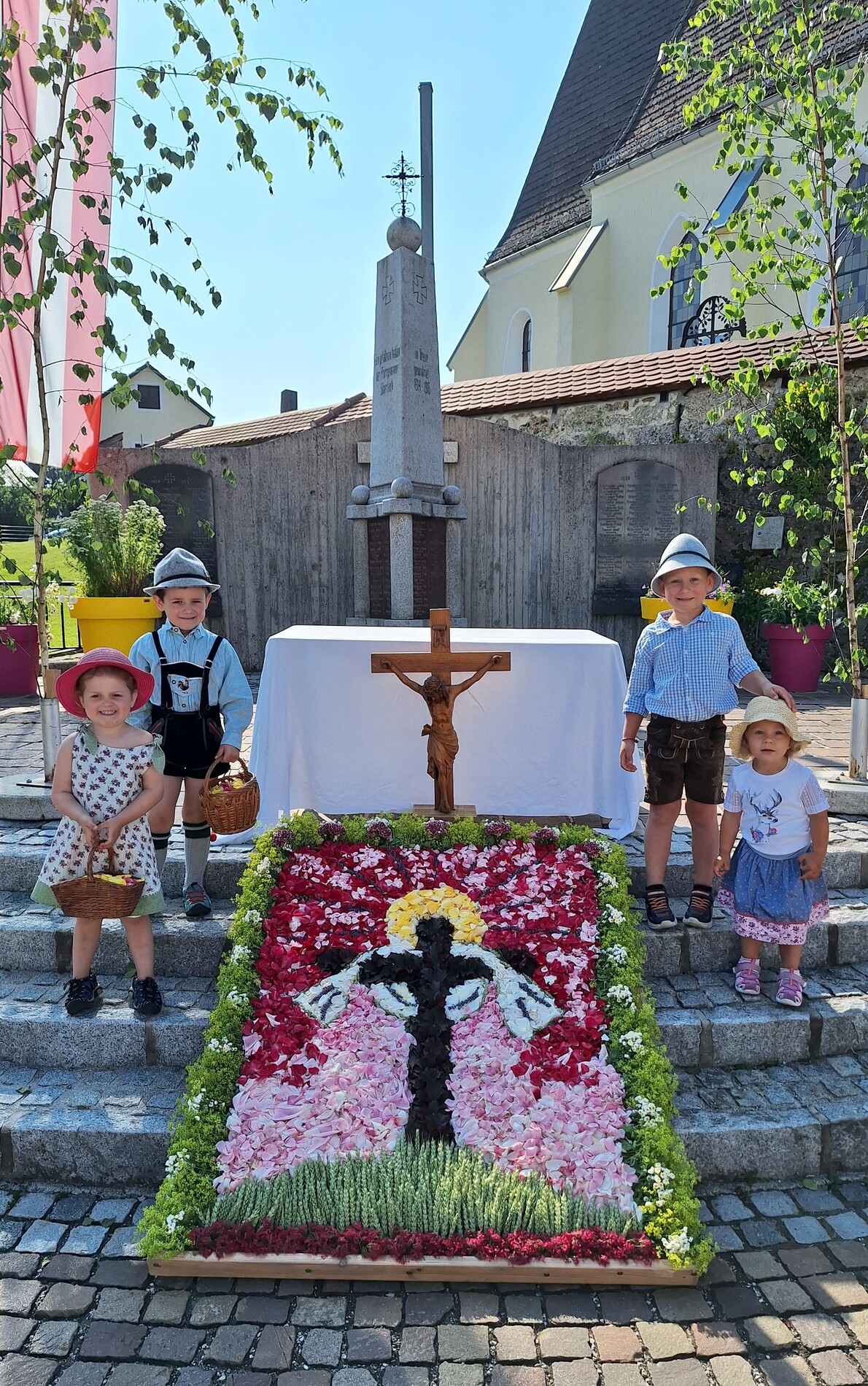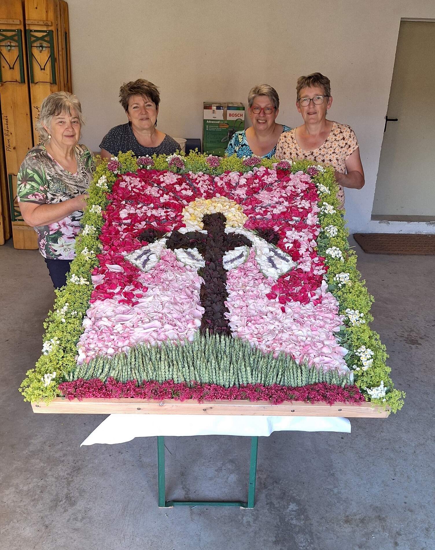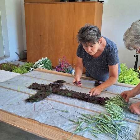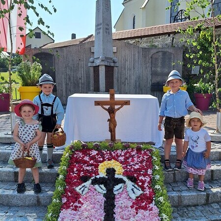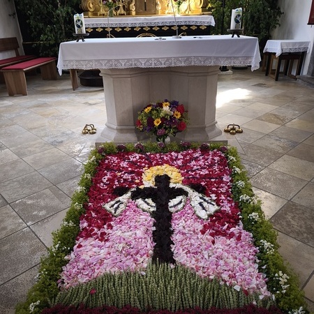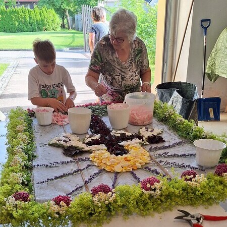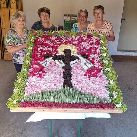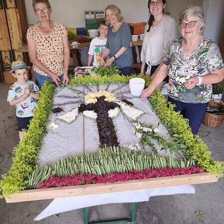 Seit 2020 gibt es sie - die Tradition des Blumenmosaiks zu Fronleichnam: Rund um Cilli Kammerhofer und die Damen der kfb hat sich ein Stammteam gebildet, das schon zum 6. Mal ein wunderschönes Blumen- und Blütenbild gesteckt bzw. gelegt hat - immer aus den aktuell blühenden Blumen, die von wohlmeinenden GartenbesitzerInnen gespendet werden.