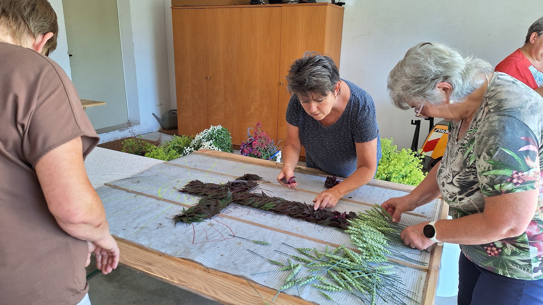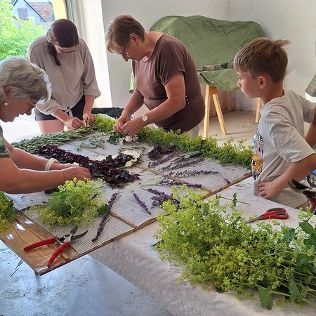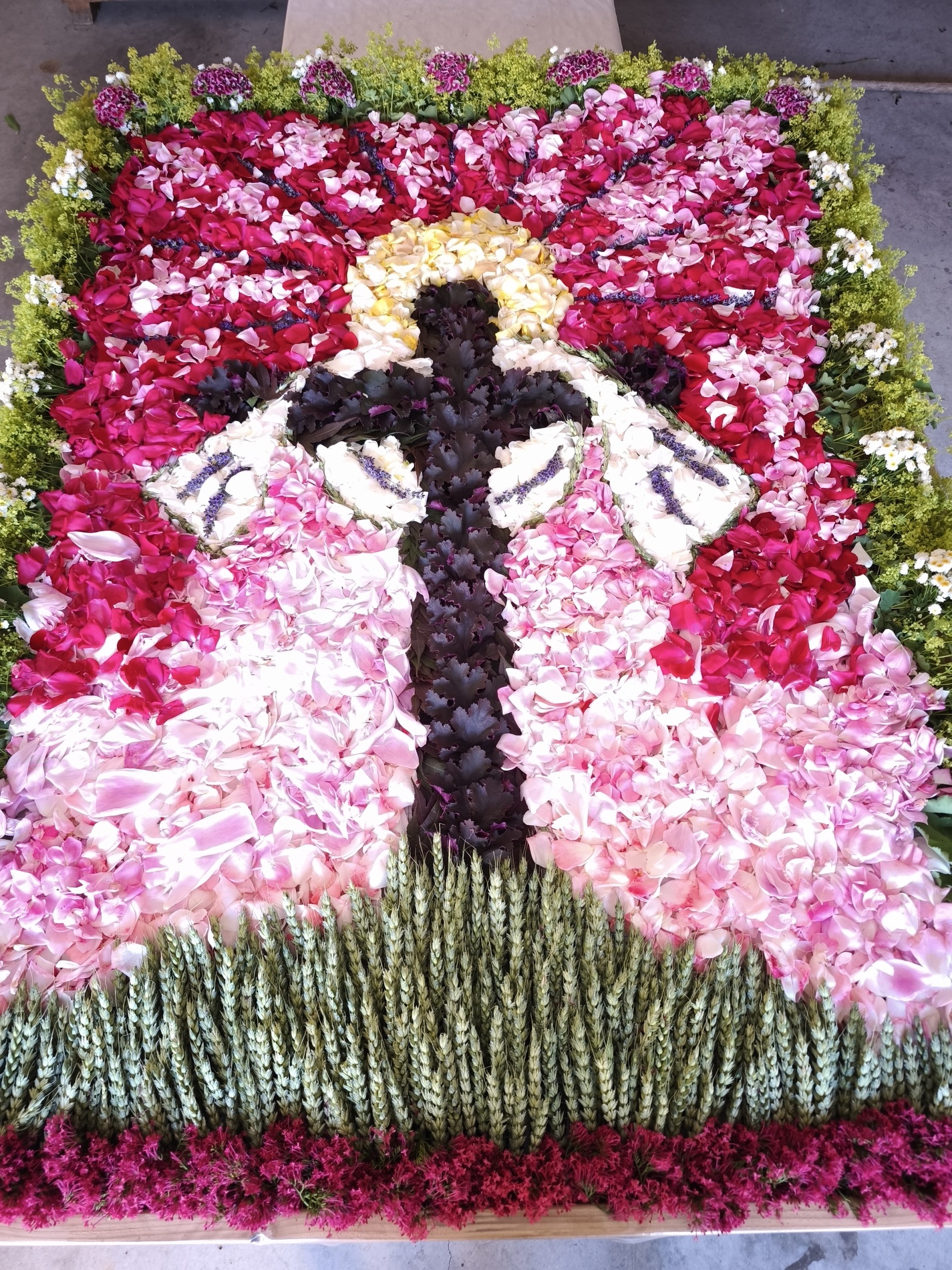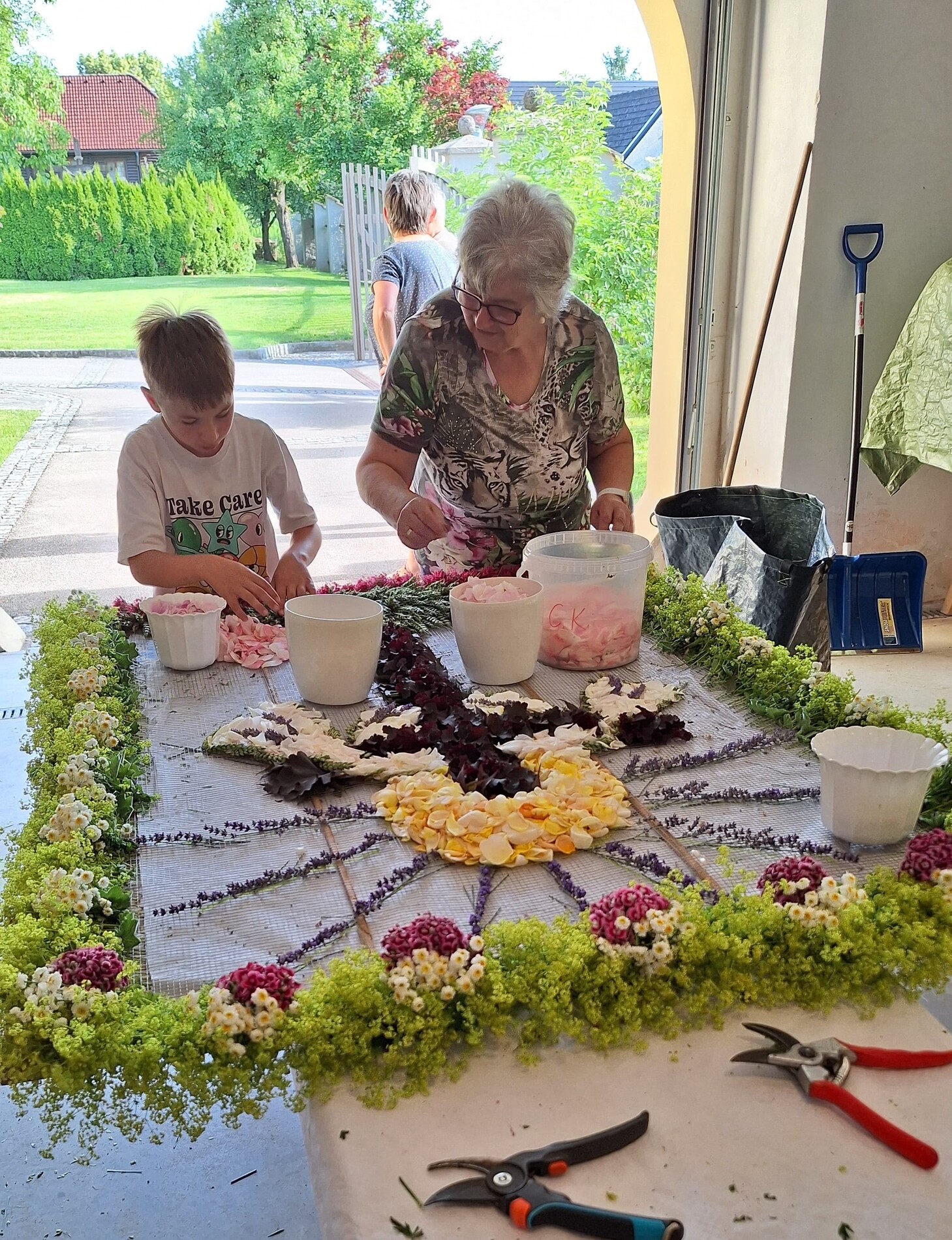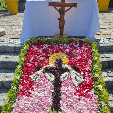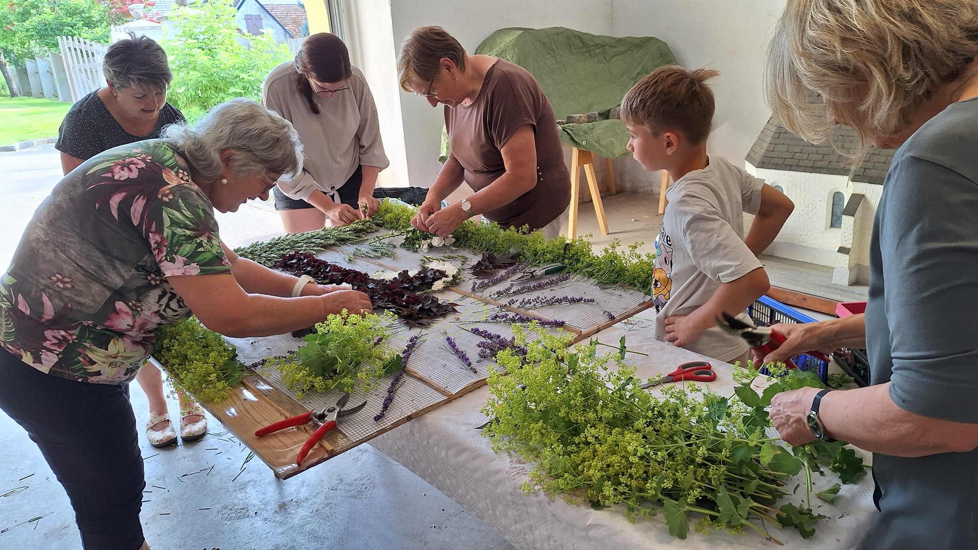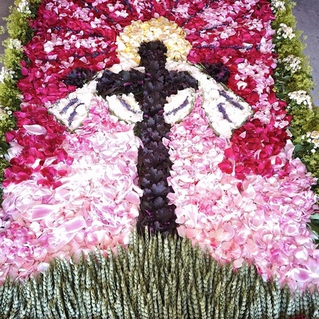 Seit 2020 gibt es sie - die Tradition des Blumenmosaiks zu Fronleichnam: Rund um Cilli Kammerhofer und die Damen der kfb hat sich ein Stammteam gebildet, das schon zum 6. Mal ein wunderschönes Blumen- und Blütenbild gesteckt bzw. gelegt hat - immer aus den aktuell blühenden Blumen, die von wohlmeinenden GartenbesitzerInnen gespendet werden.