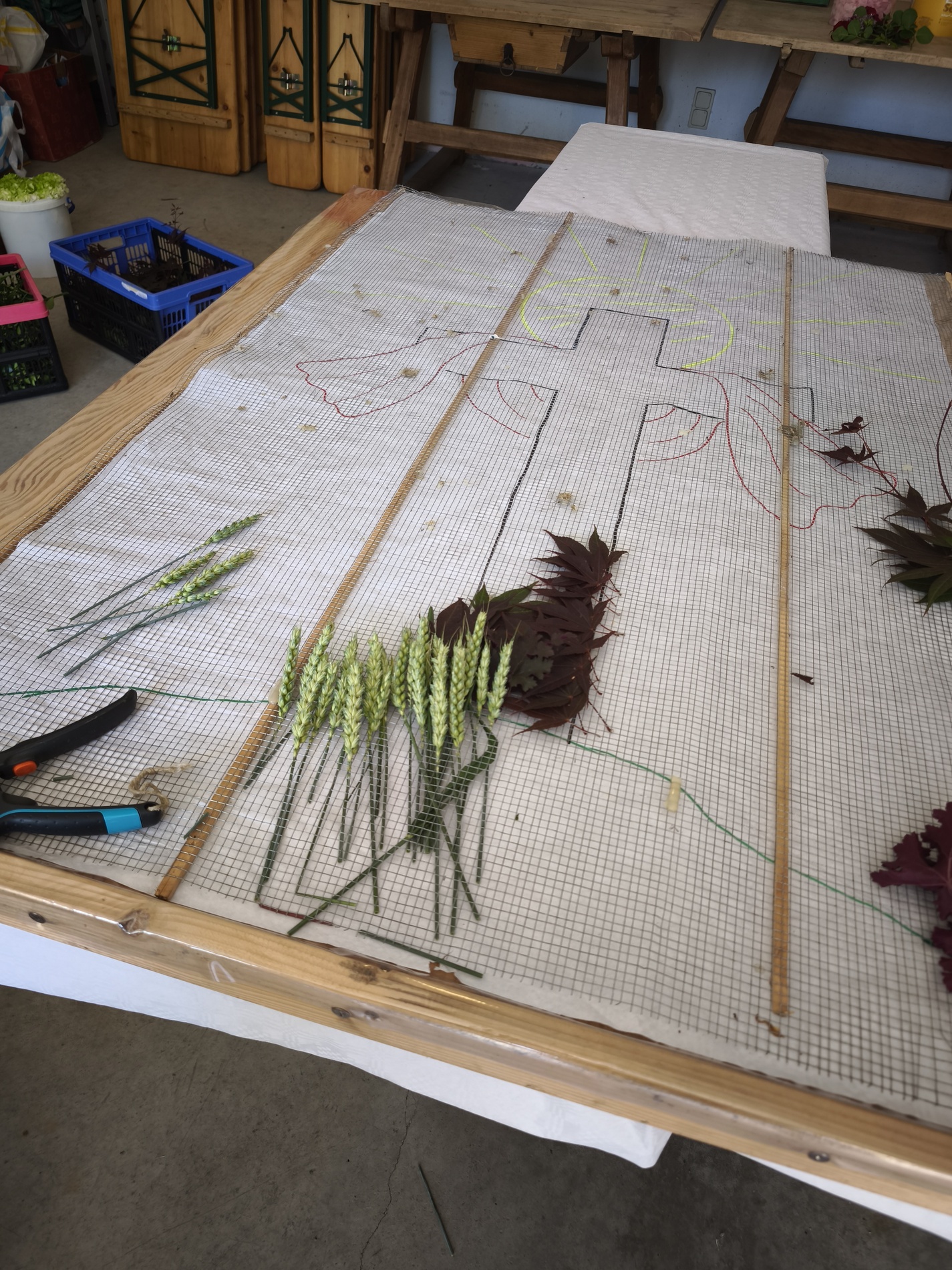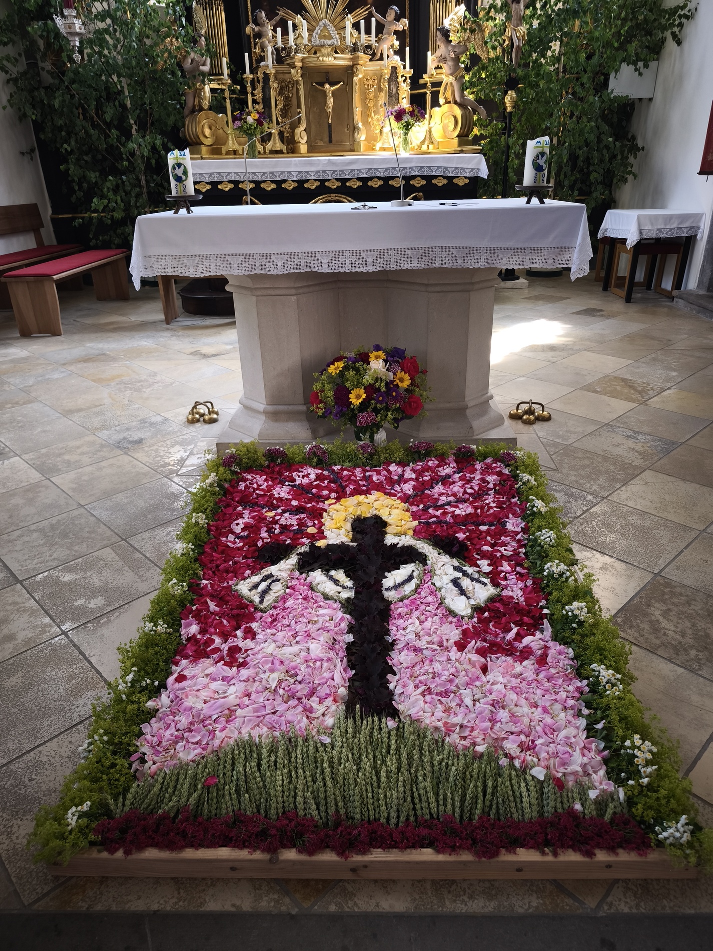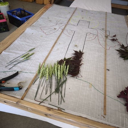 Heuer steht ein Kreuz mit Strahlenkranz auf einem Hügel aus Getreideähren, welches das weiße Tuch der Auferstehung trägt. Und so wie jedes Jahr gibt es das Bild noch einige Tage in der Kirche zu bestaunen ... kommt und seht!
