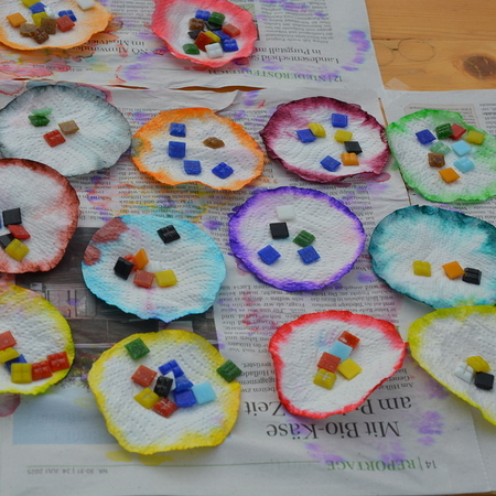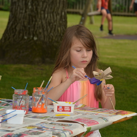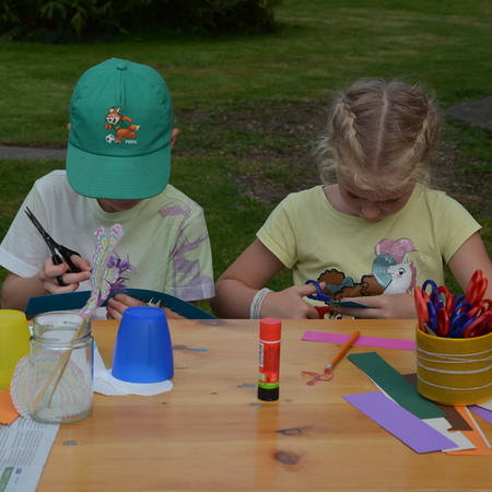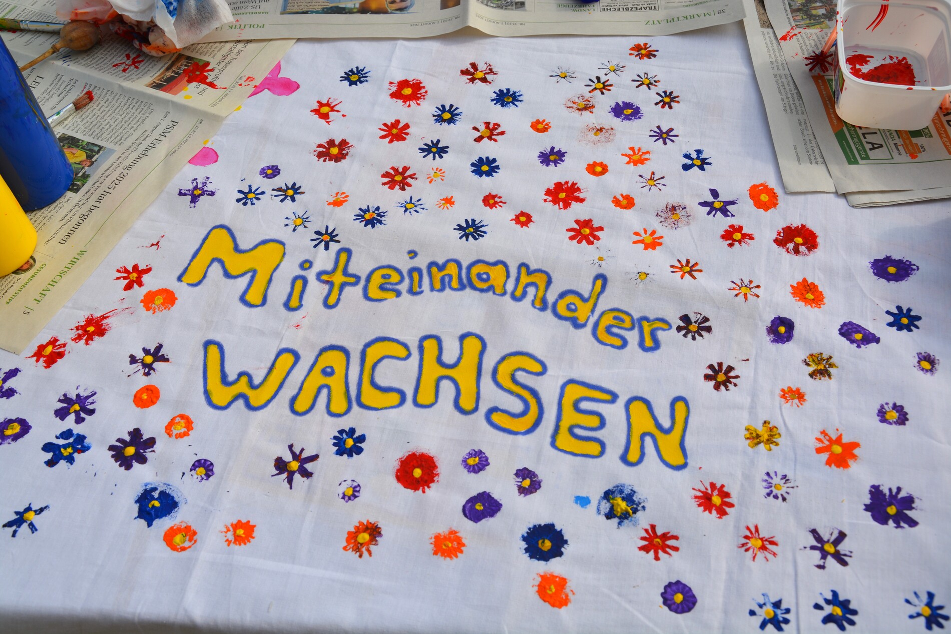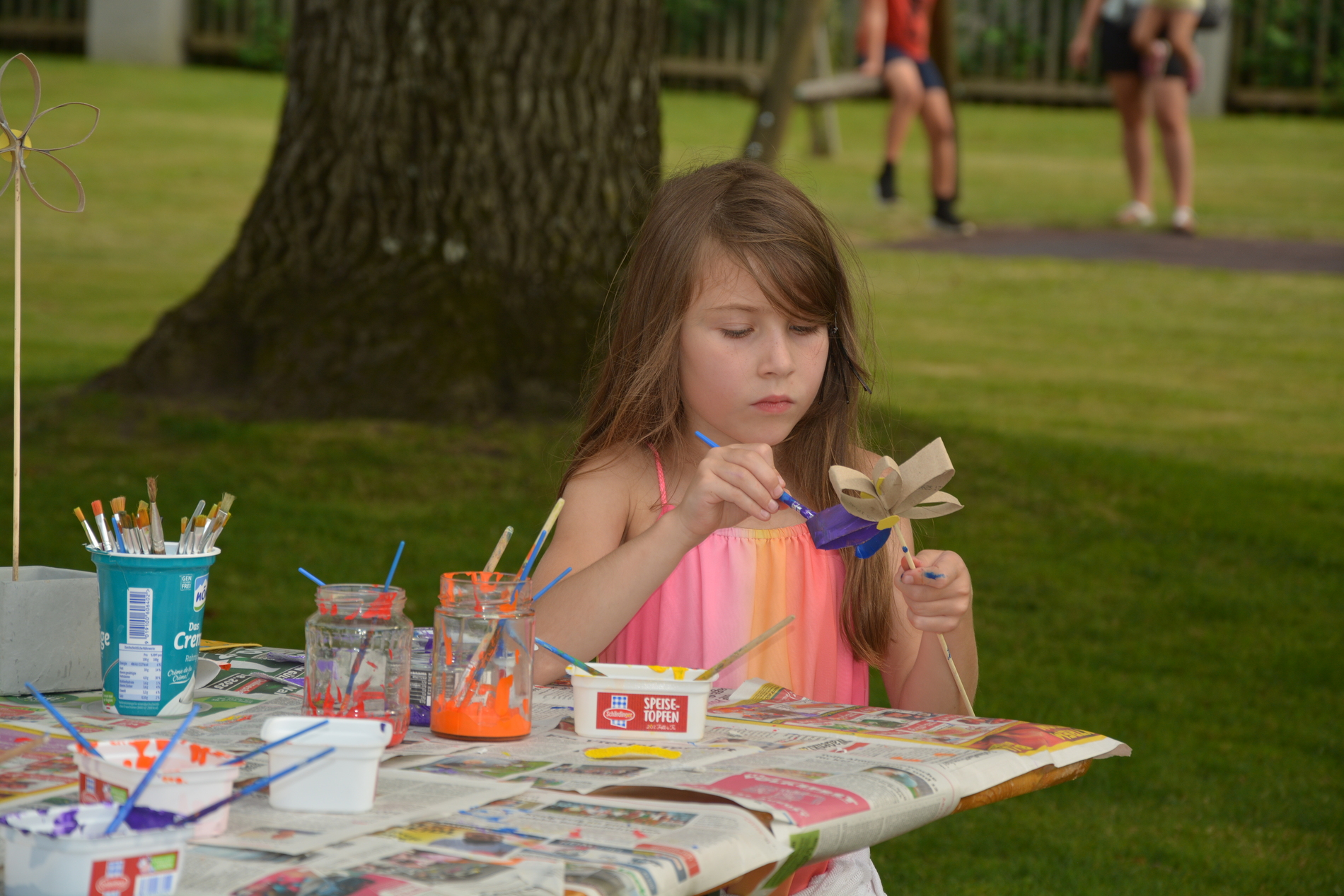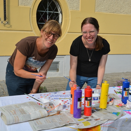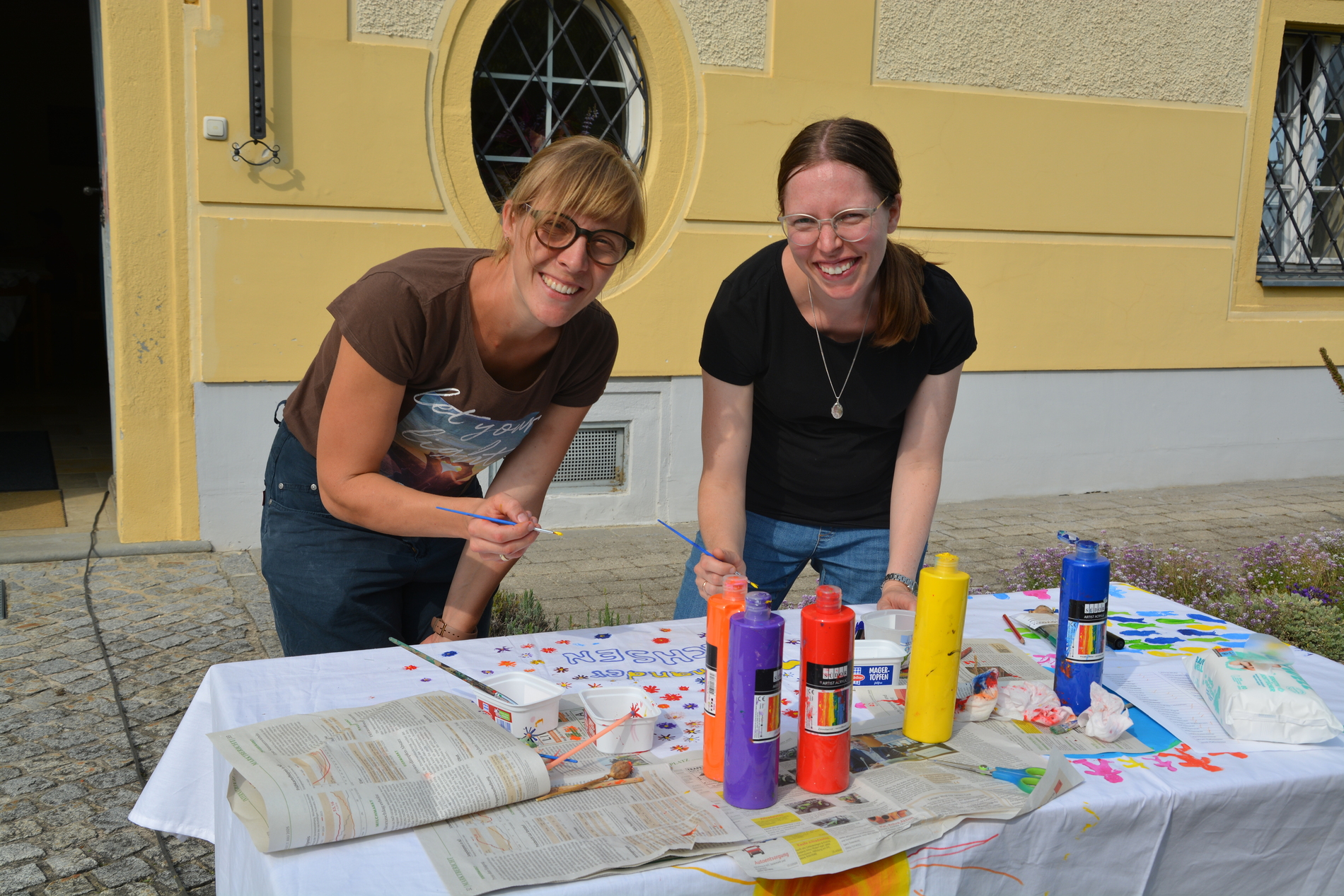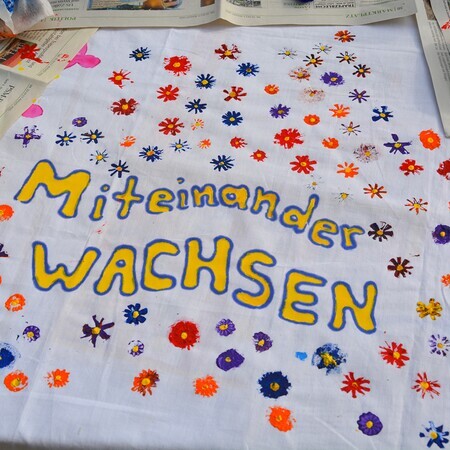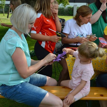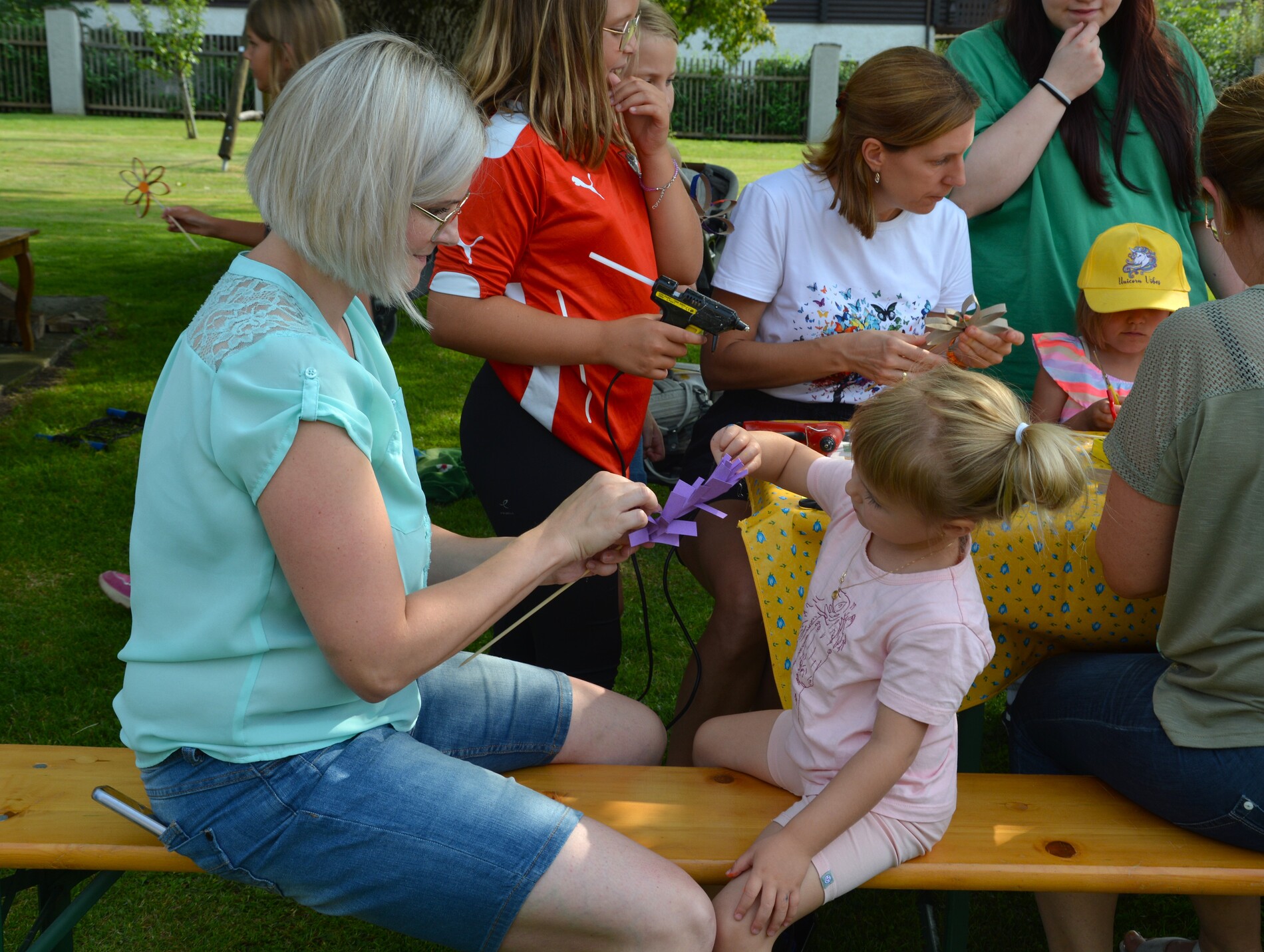 Zum Thema „Miteinander wachsen“ wurden zunächst einige Lieder mit Bewegungen einstudiert, die auch bei der nächsten Familienmesse (07.09.25 um 10 Uhr – herzliche Einladung!) gesungen werden. Dann startete der kreative Programmteil. Passend zum Thema durften die Kinder verschiedene Blumen basteln und auch auf dem Altartuch ihren Blumenabdruck verewigen. Auch gab es die Möglichkeit, sich mit Bällen, Springseilen und anderen Bewegungsspielen auszutoben. Jederzeit konnten sich die Kinder an einem leckeren Kuchen- und Jausenbuffet stärken.