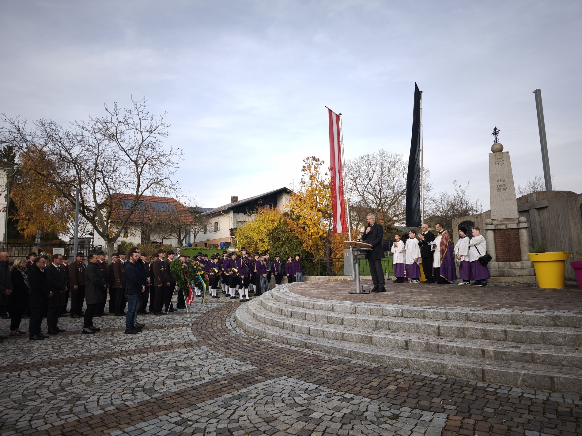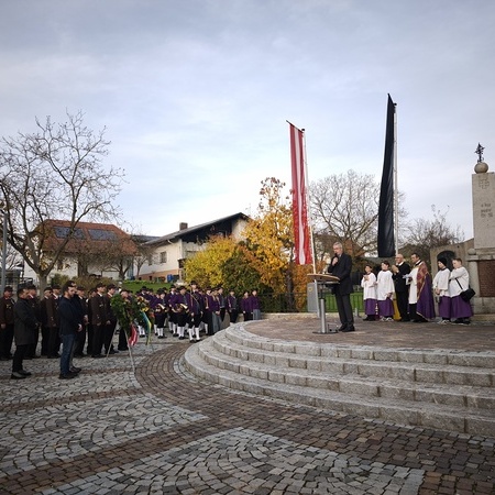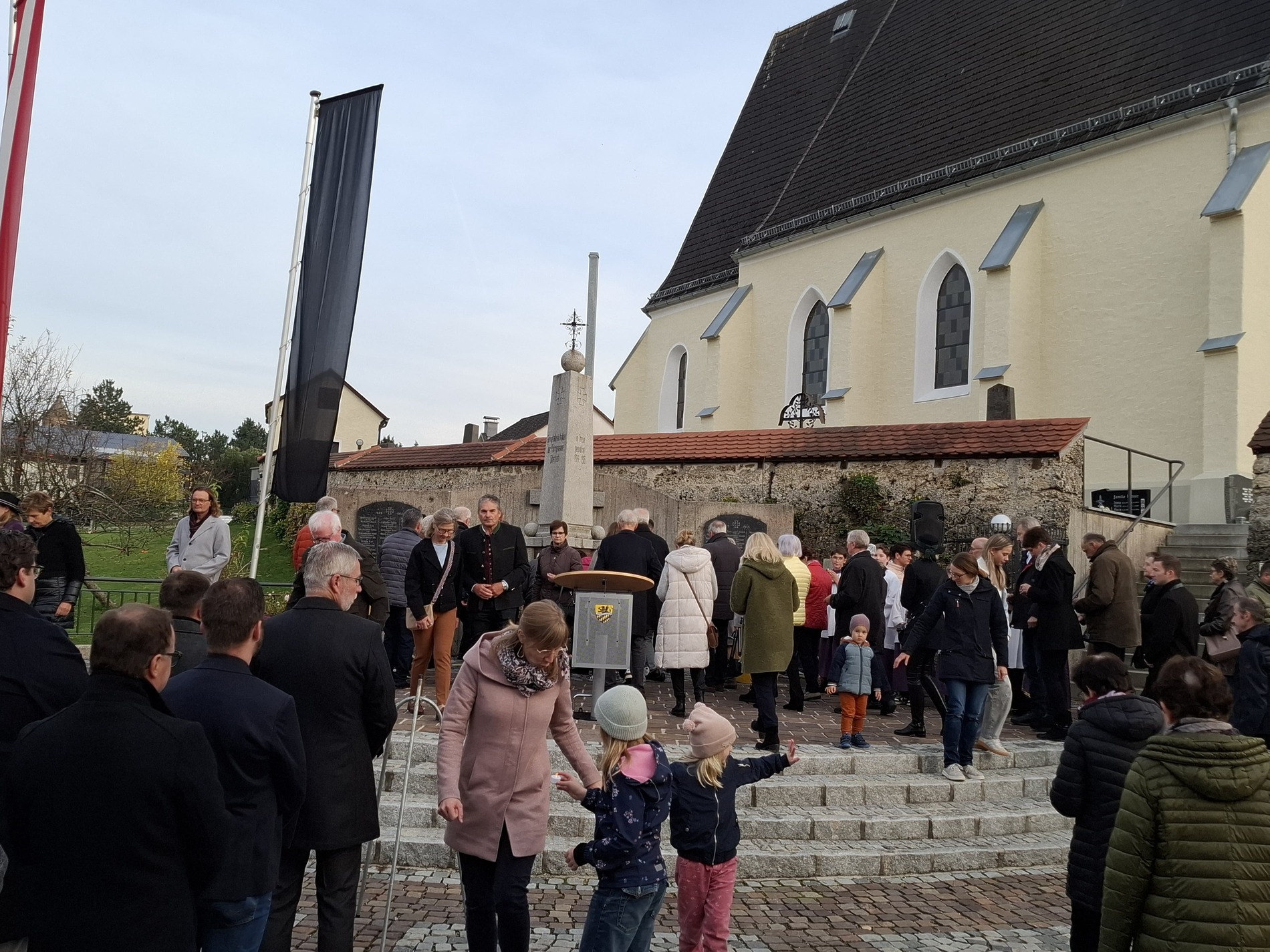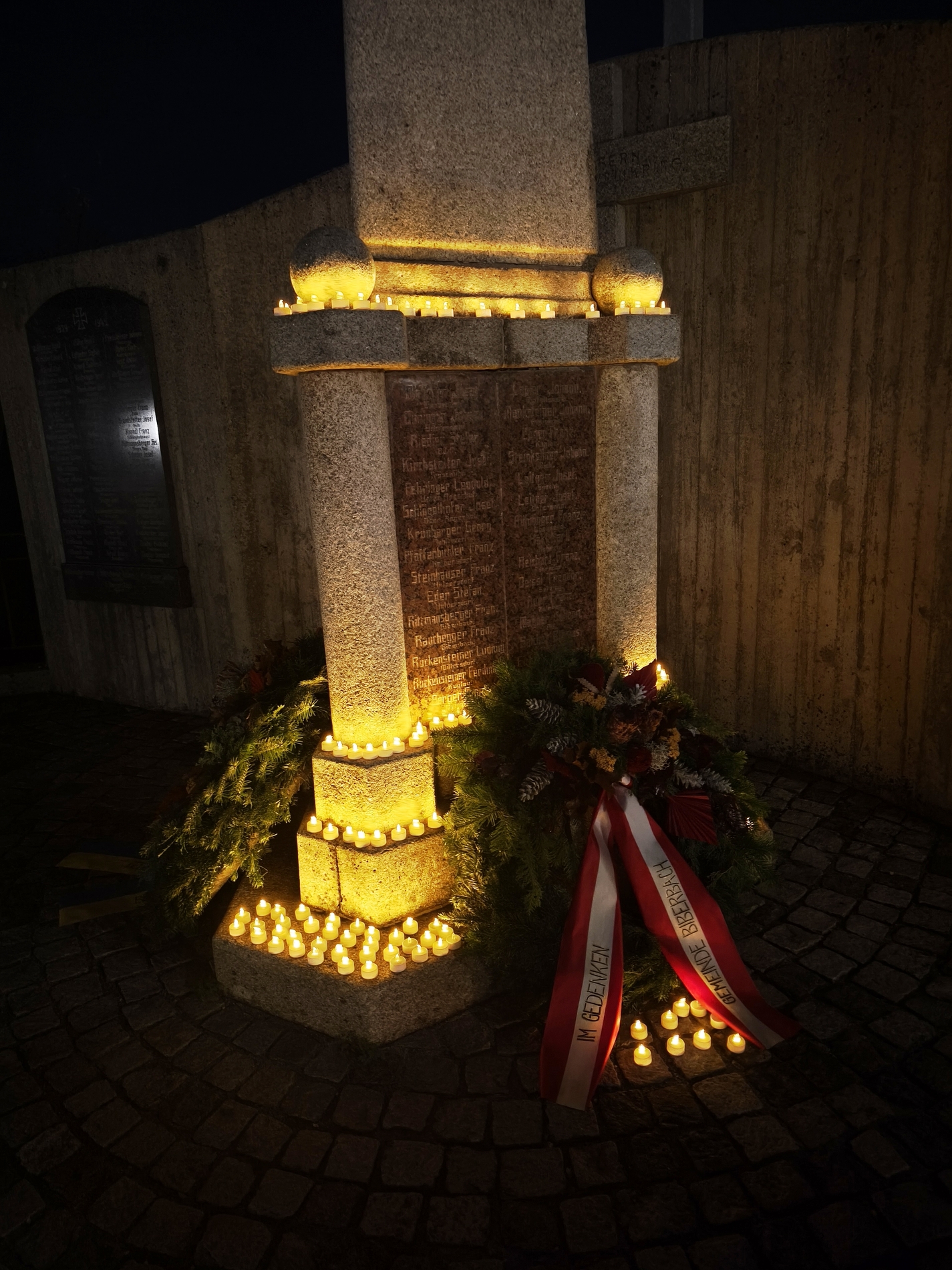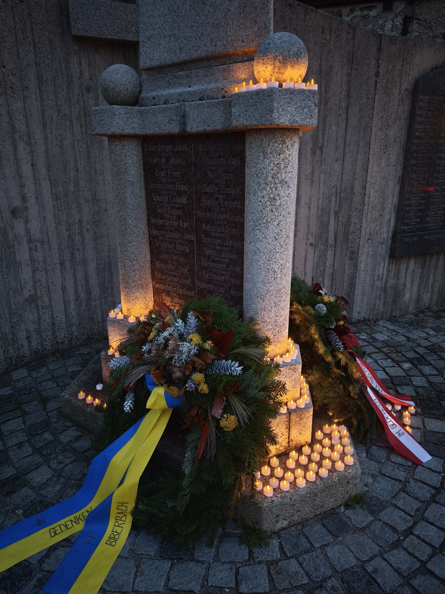 KriegerGedächtnisfeier der Pfarre und Gemeinde: begleitet von der Musikkapelle, der Feuerwehr und der Gemeinde-Vertretung fand am Dorfplatz die Gedenkfeier mit Kranzniederlegung statt. BGM Fritz Hinterleitner stellte noch einmal das Projekt Weltkrieg-Gedenken vor und lud zum Besuch der Ausstellungen und der Veranstaltungen ein. Im Anschluss entzündete die Bevölkerung 127 Lichter rund um das Kriegerdenkmal - ein Licht für jeden gefallen Biberbacher Soldaten, der am Denkmal vermerkt ist ...