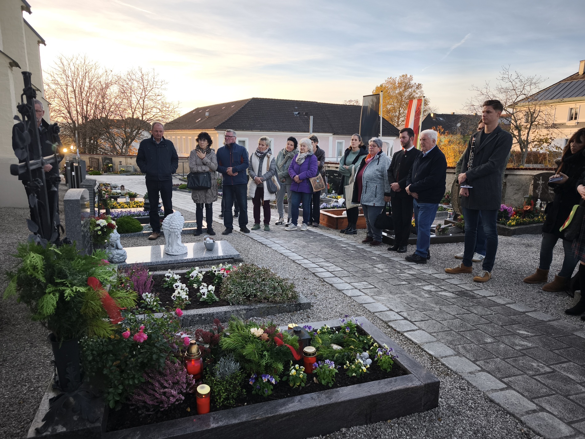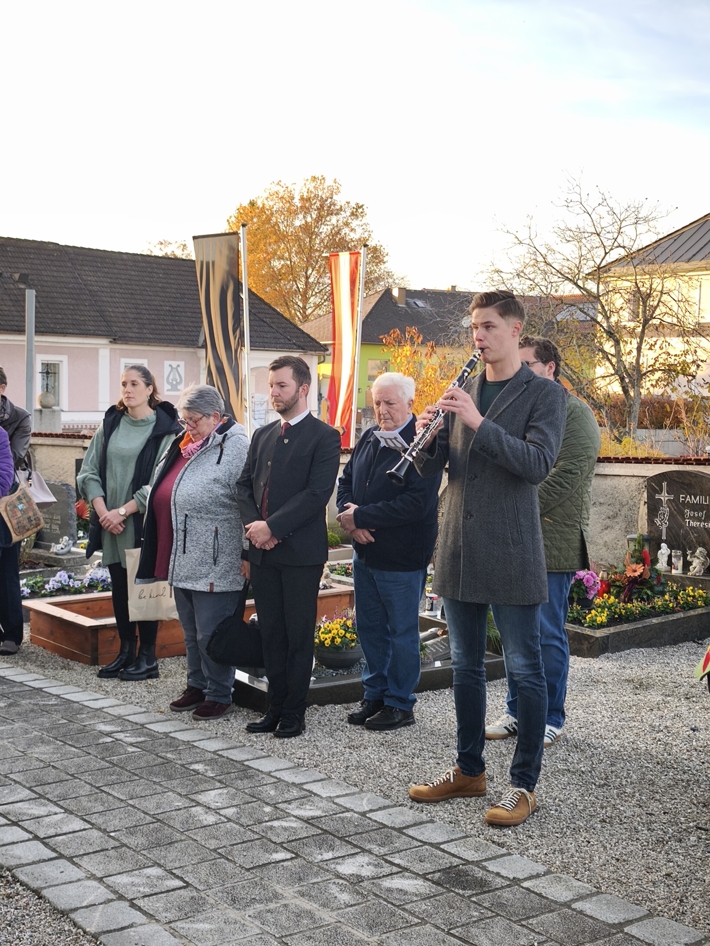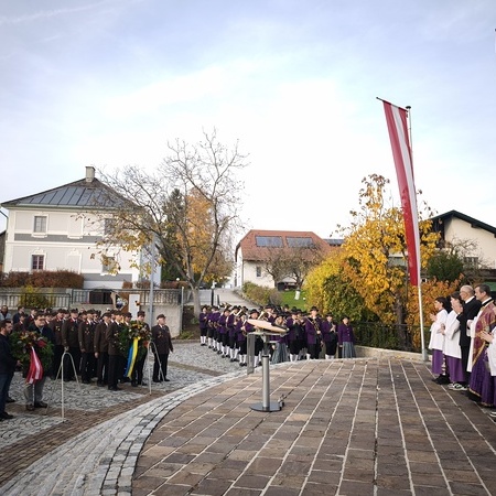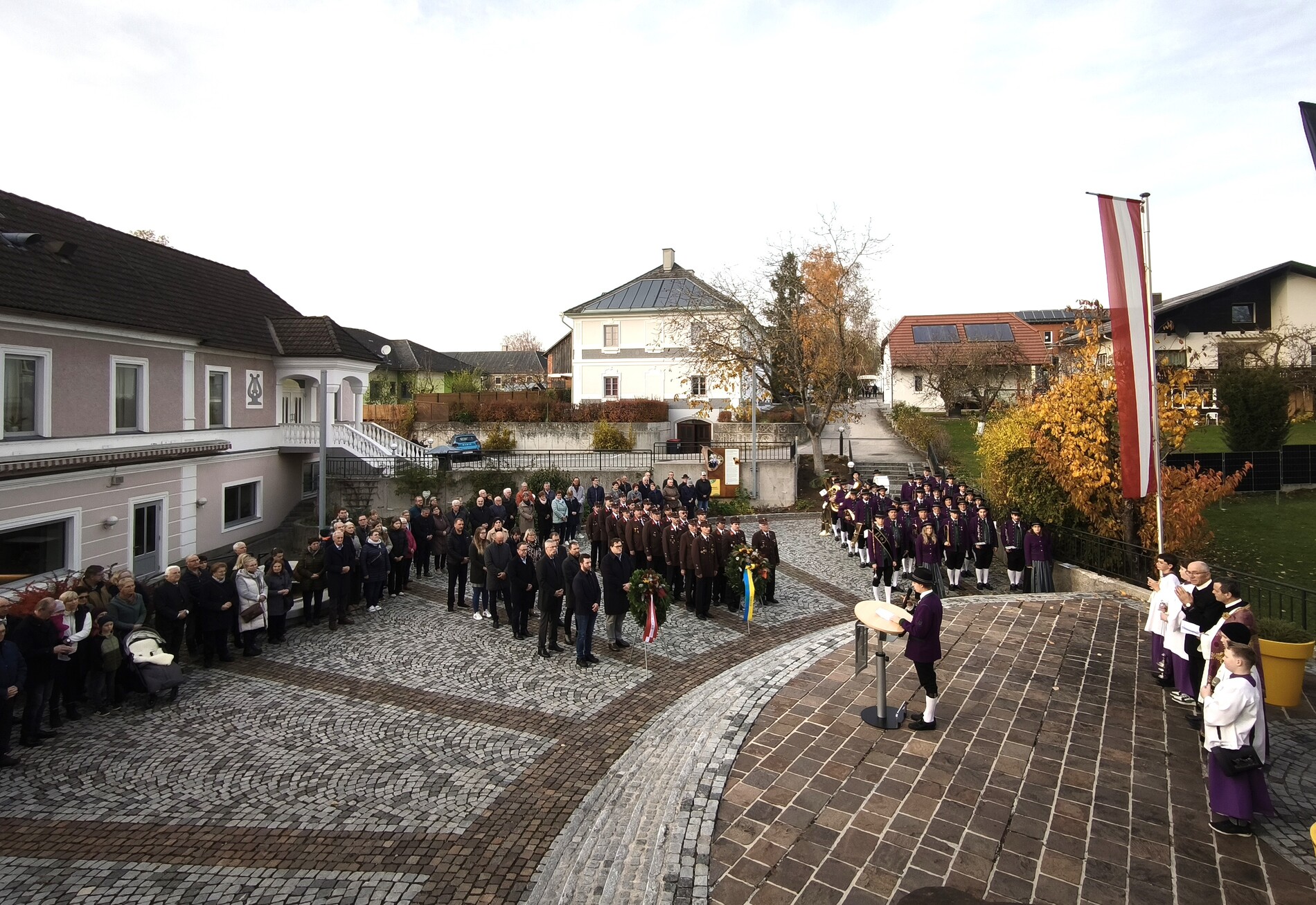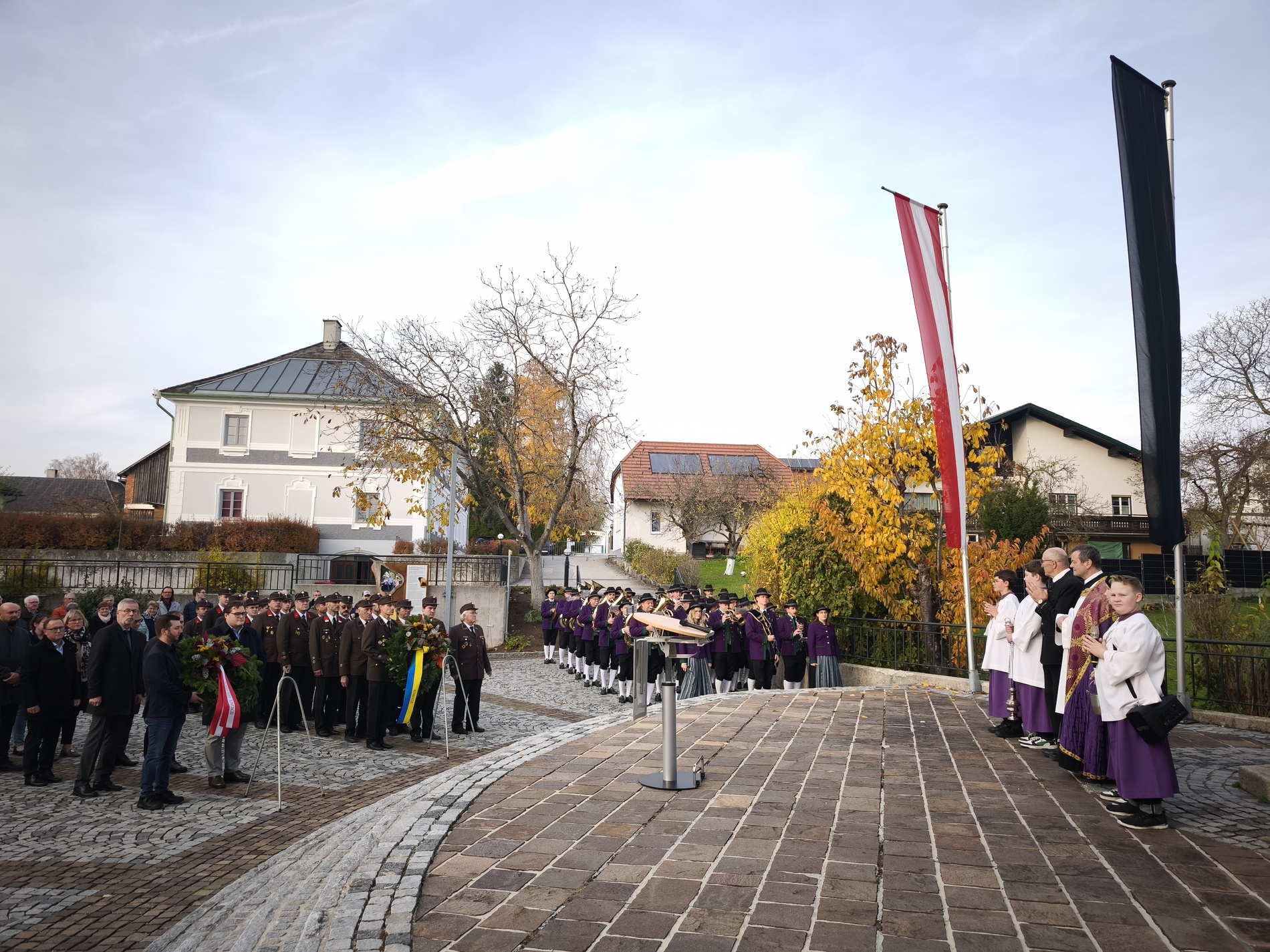 KriegerGedächtnisfeier der Pfarre und Gemeinde: begleitet von der Musikkapelle, der Feuerwehr und der Gemeinde-Vertretung fand am Dorfplatz die Gedenkfeier mit Kranzniederlegung statt. BGM Fritz Hinterleitner stellte noch einmal das Projekt Weltkrieg-Gedenken vor und lud zum Besuch der Ausstellungen und der Veranstaltungen ein. Im Anschluss entzündete die Bevölkerung 127 Lichter rund um das Kriegerdenkmal - ein Licht für jeden gefallen Biberbacher Soldaten, der am Denkmal vermerkt ist ...