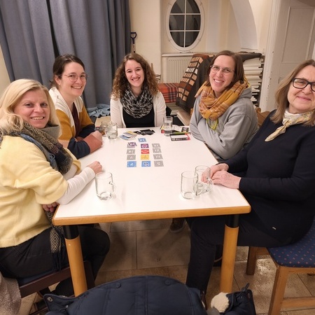 Auch beim 2. Termin wurde an 4 Tischen gespielt und gezockt, das gleiche Spiel den ganzen Abend lang oder es wurden mehrere Spiele hintereinander ausprobiert. Auf jeden Fall ging es hoch her und immer wieder waren auch Jubelrufe der Gewinnerinnen zu hören -:)