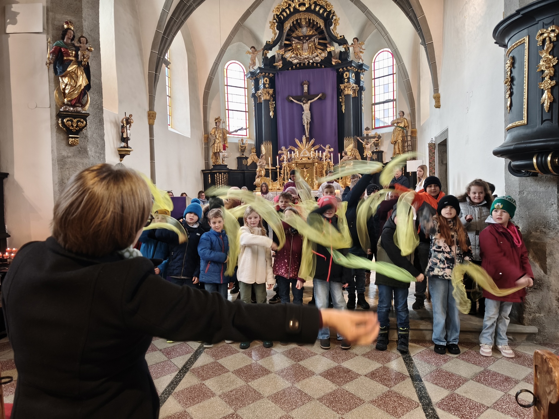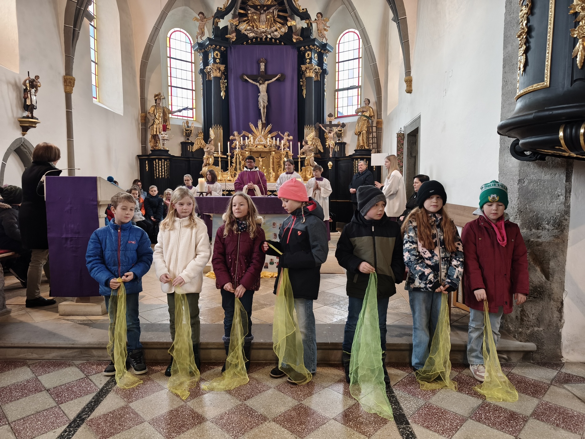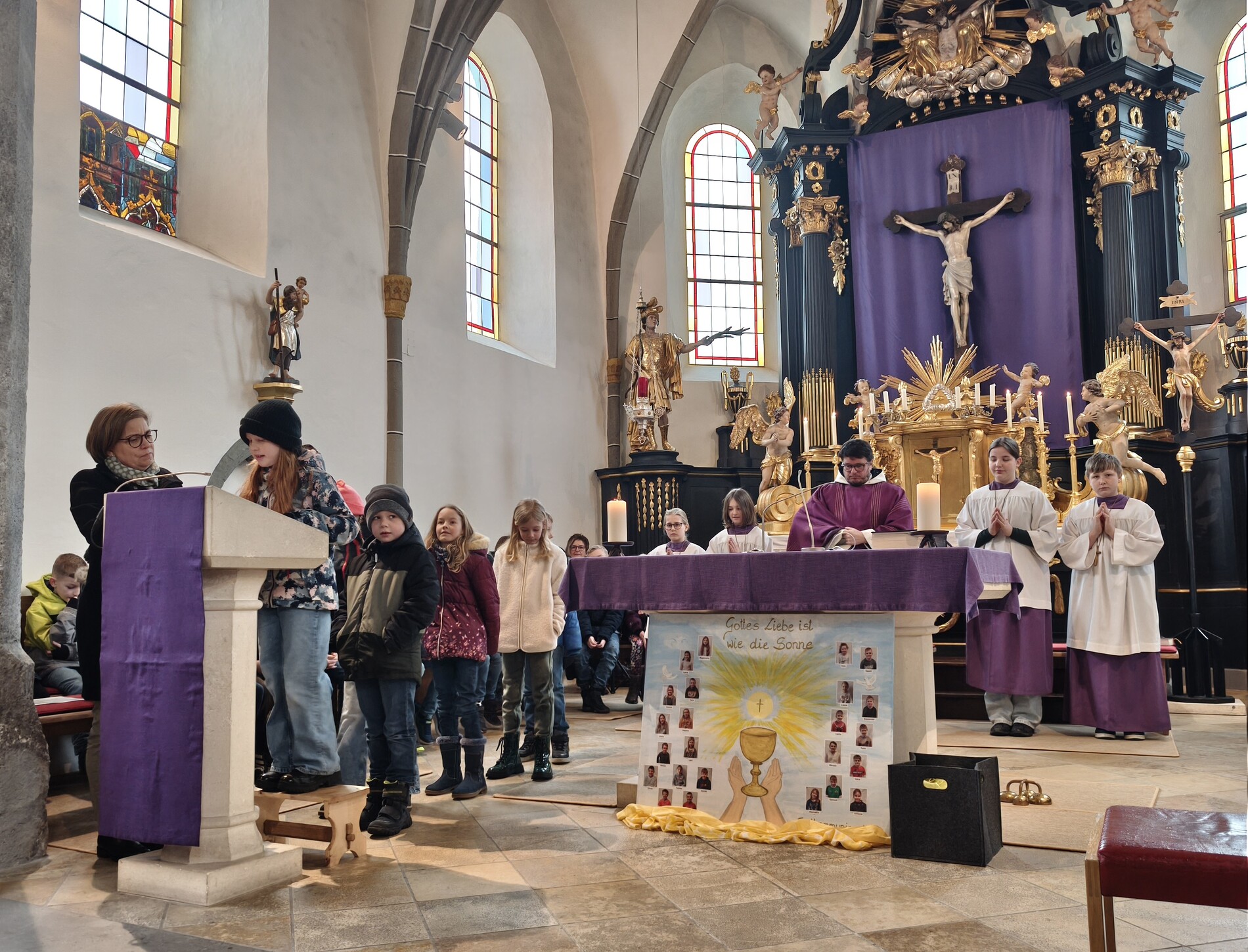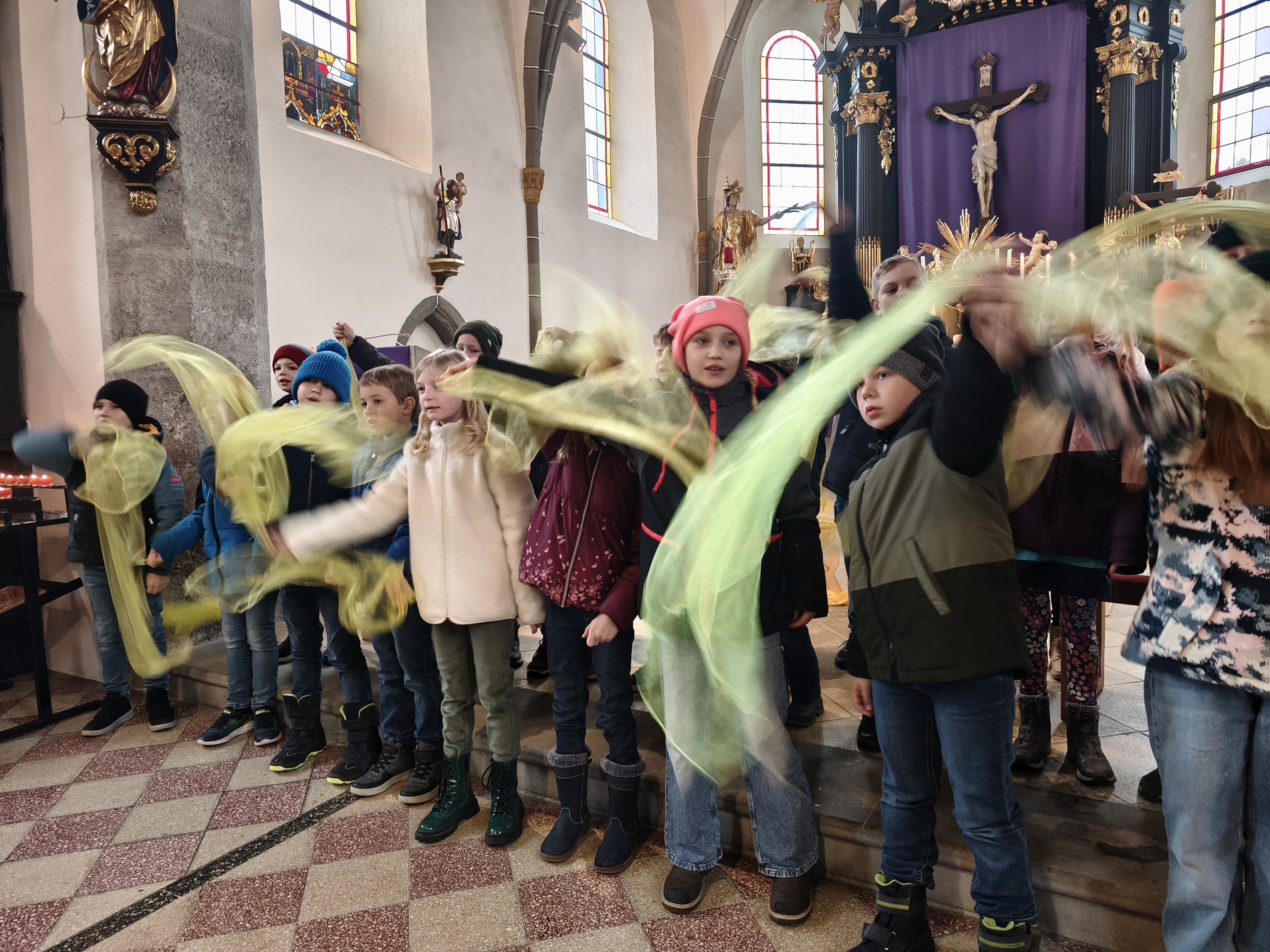 24 Kinder bereiten sich heuer in unserer Pfarre auf das Fest der Erstkommunion vor. Am ersten Fastensonntag durften sich die Kinder dazu während des Sonntagsgottesdienstes mit einem persönlichen Satz vorstellen. Mit einem Sonnentücher-Tanz zum Lied „Gottes Liebe ist wie die Sonne“ wurde das diesjährige Motto weiter zum Ausdruck gebracht.