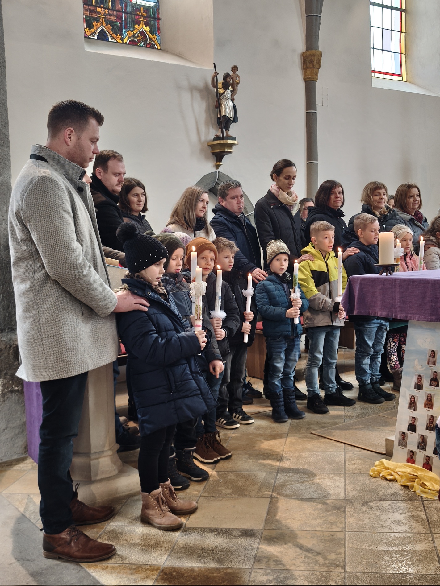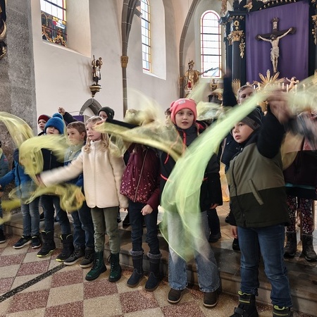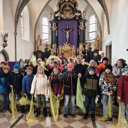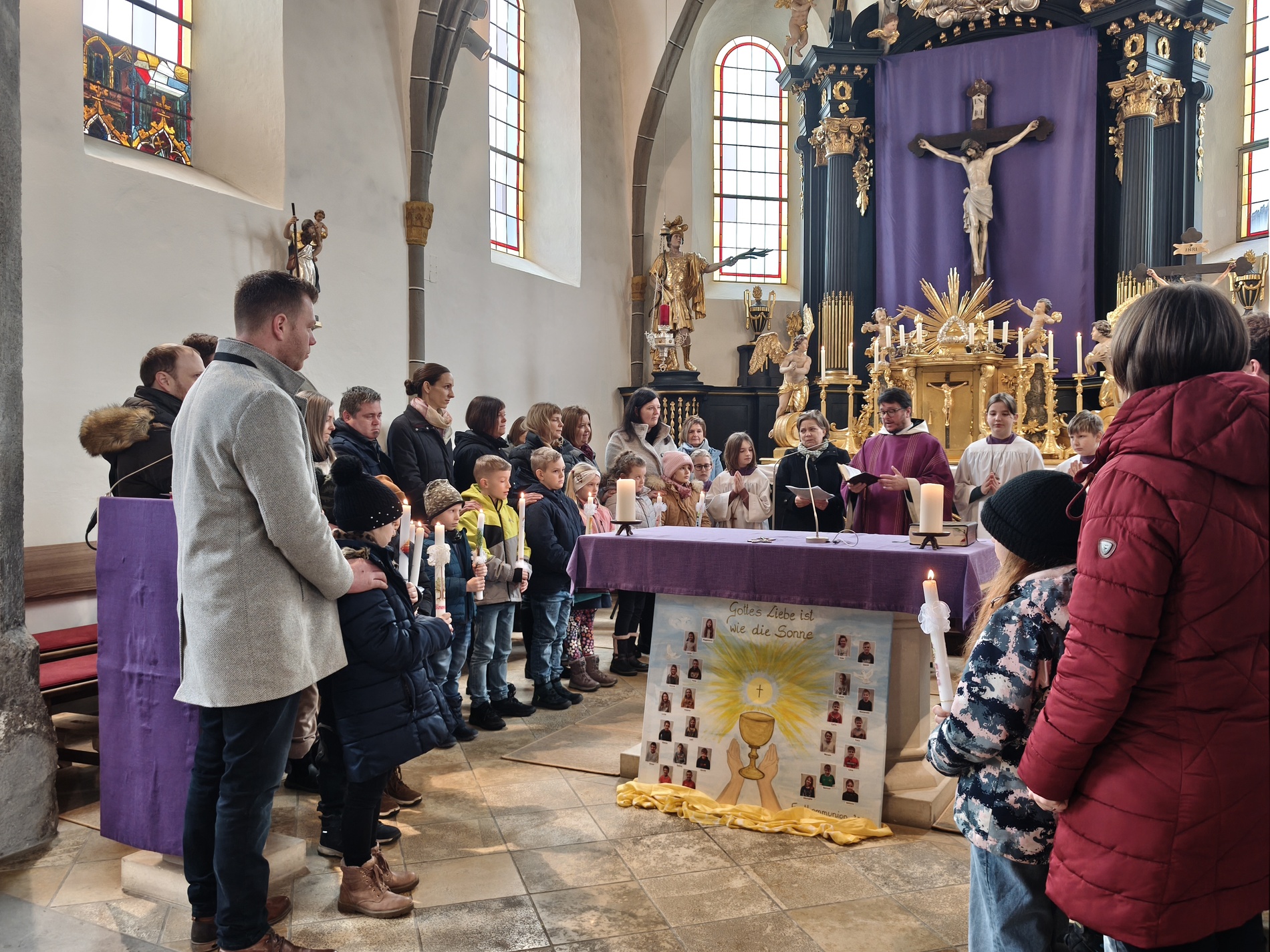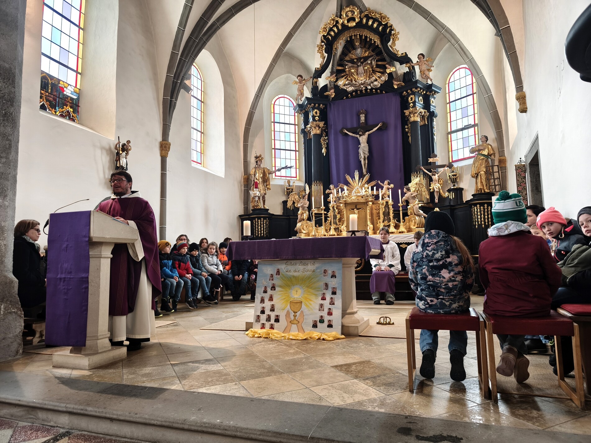 24 Kinder bereiten sich heuer in unserer Pfarre auf das Fest der Erstkommunion vor. Am ersten Fastensonntag durften sich die Kinder dazu während des Sonntagsgottesdienstes mit einem persönlichen Satz vorstellen. Mit einem Sonnentücher-Tanz zum Lied „Gottes Liebe ist wie die Sonne“ wurde das diesjährige Motto weiter zum Ausdruck gebracht.
