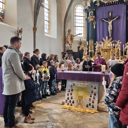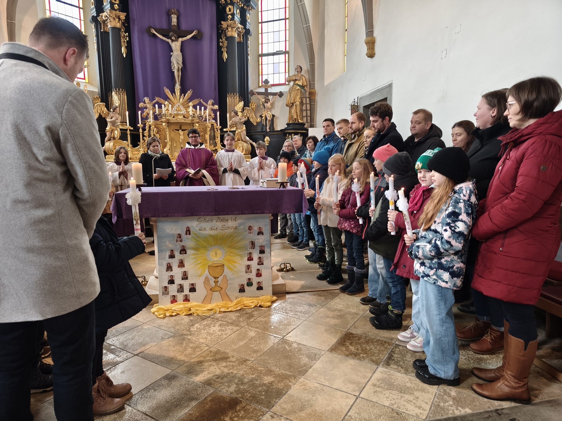 Immer wieder ein besonderer Moment beim Vorstellungs-Gottesdienst ist die Erneuerung des Taufversprechens der Erstkommunionkinder. Begleitet von ihren Taufpaten bekräftigten sie ihren Glauben und das Versprechen, mit Jesus leben zu wollen. „Stell dich in die Sonne, wärme dein Gesicht…vertrau auf Gottes Segen und fürchte dich nicht!“ – das haben die Kinder mit der brennenden Taufkerze gesungen – und das wünschen wir ihnen allen von Herzen!