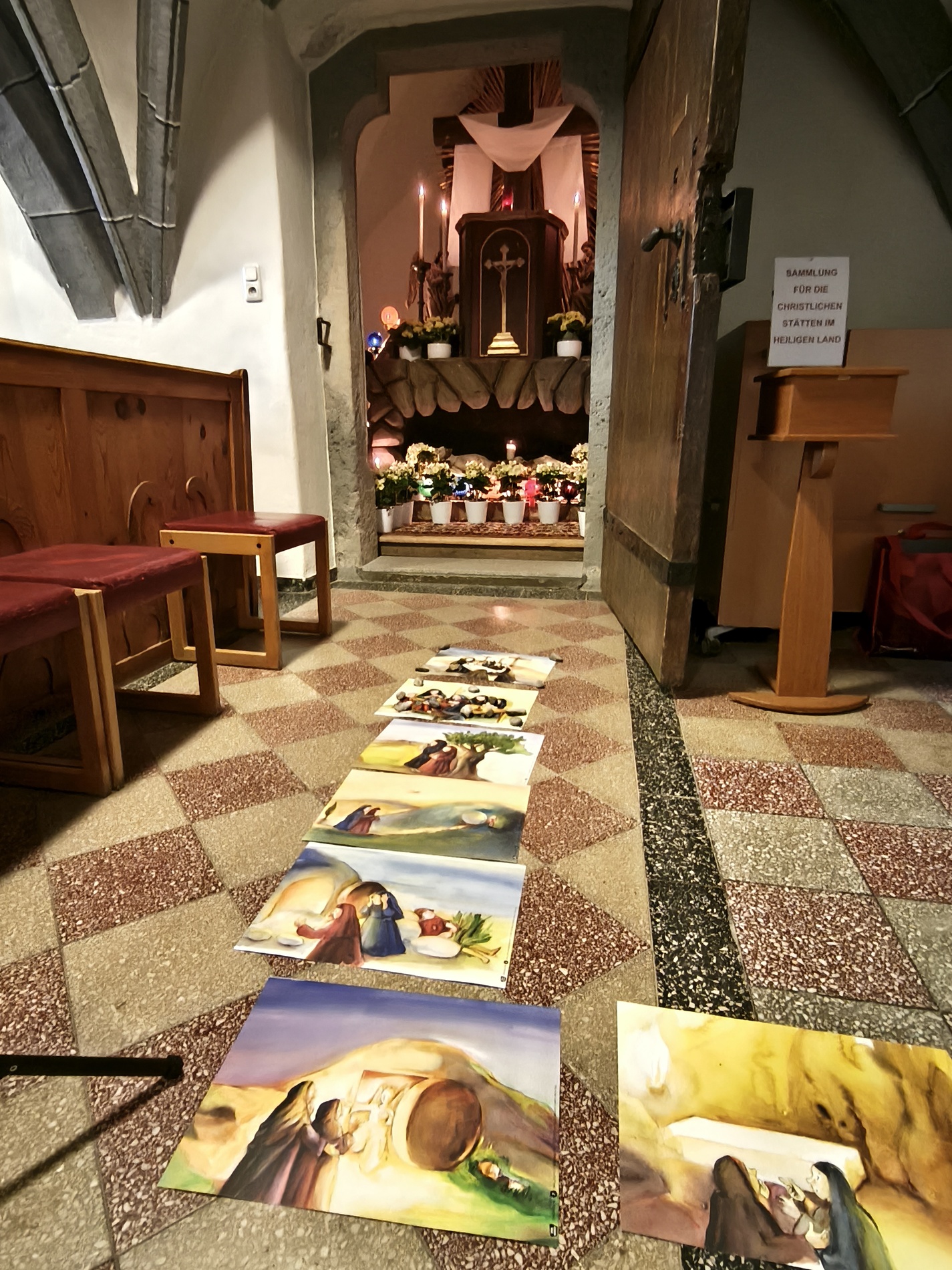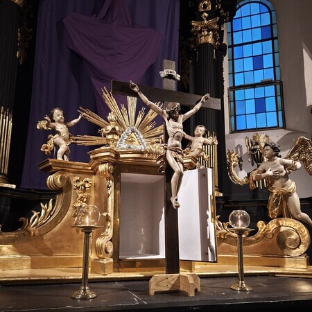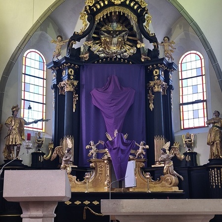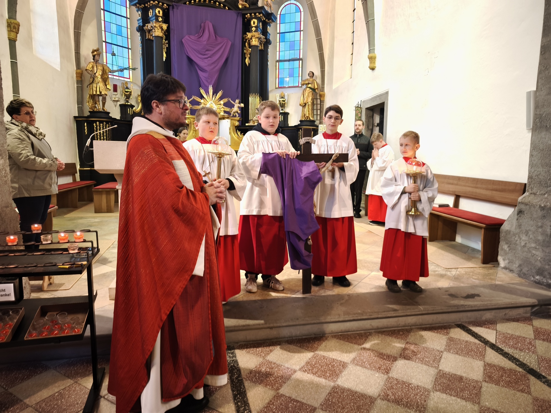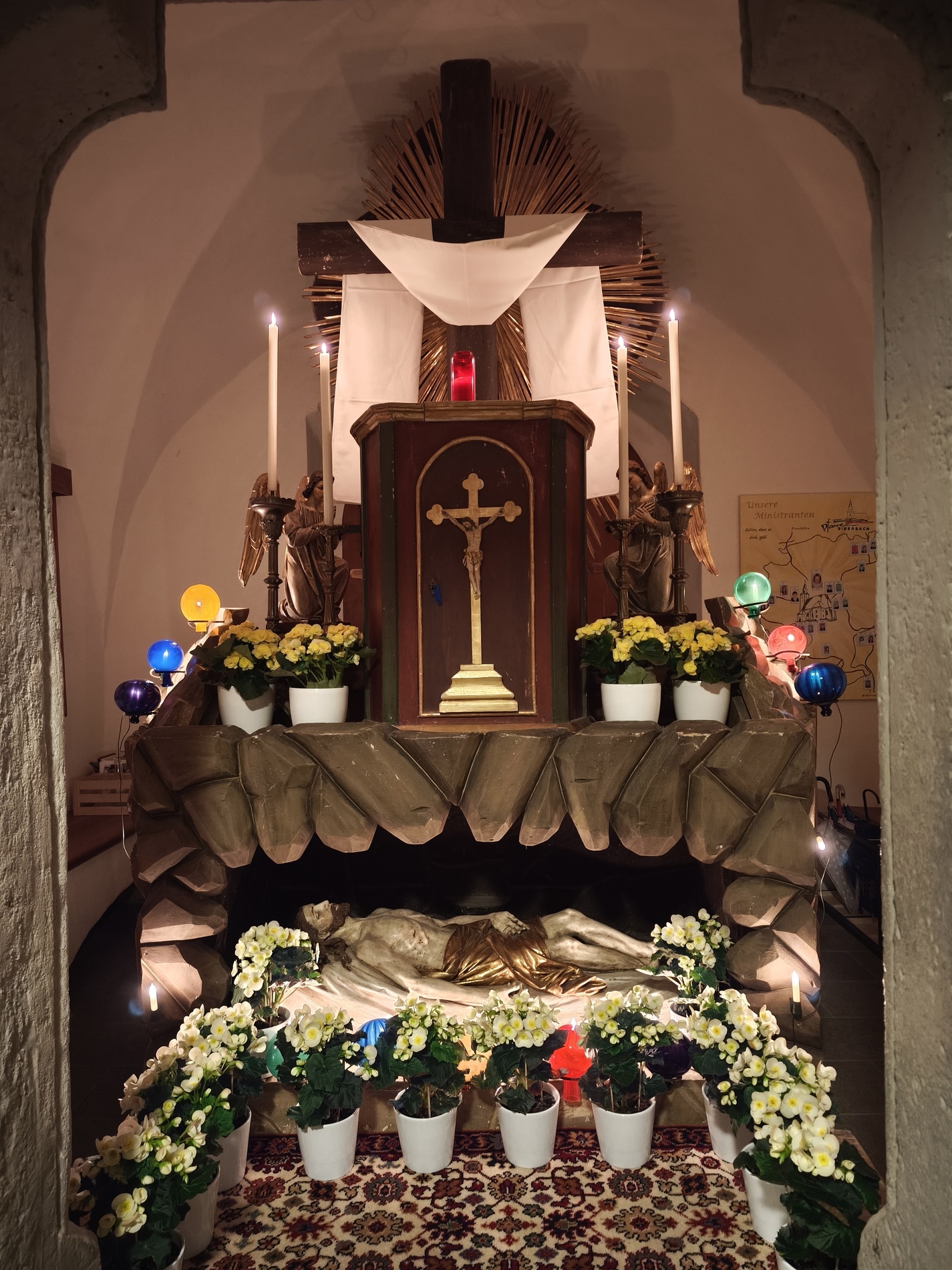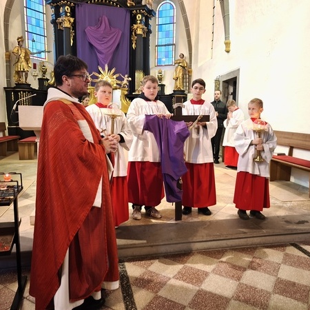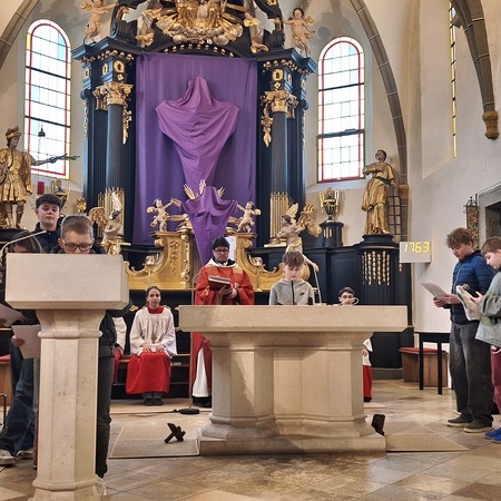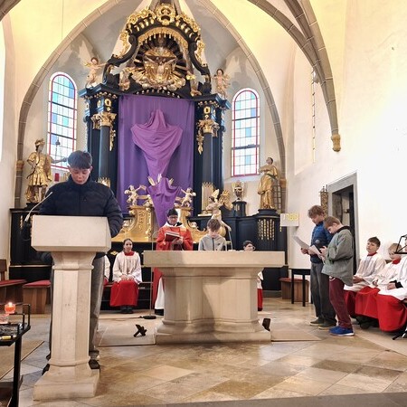 Am Karfreitag abends war P. Florian bei uns zur Feier vom Leiden und Sterben Christi, bei der die Passion wieder von einer Gruppe von Firmlingen vorgetragen wurde. Auch hier - berührend - die Liturgie mit der Leidensgeschichte, den großen Fürbitten, mit der Kreuzverehrung und der Übertragung des Kelches aus dem Tabernakel beim Hl. Grab. Entblößte Altäre, verhüllte Kreuze, kein Weihwasser, keine Licht in der Ewig-Licht-Ampel .. zeugen vom Tod Jesu am Kreuz.