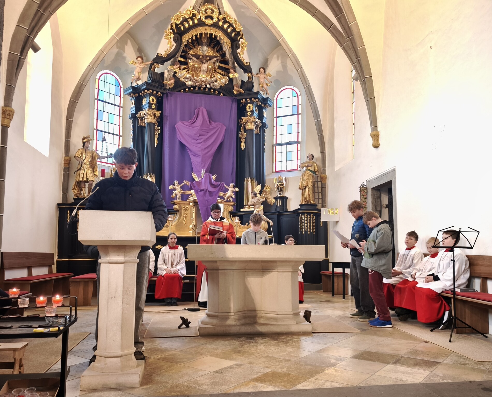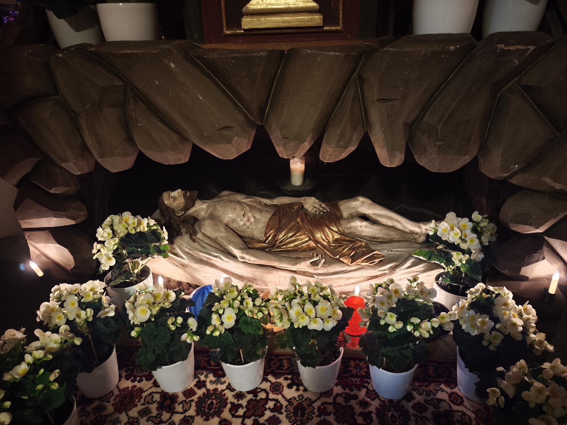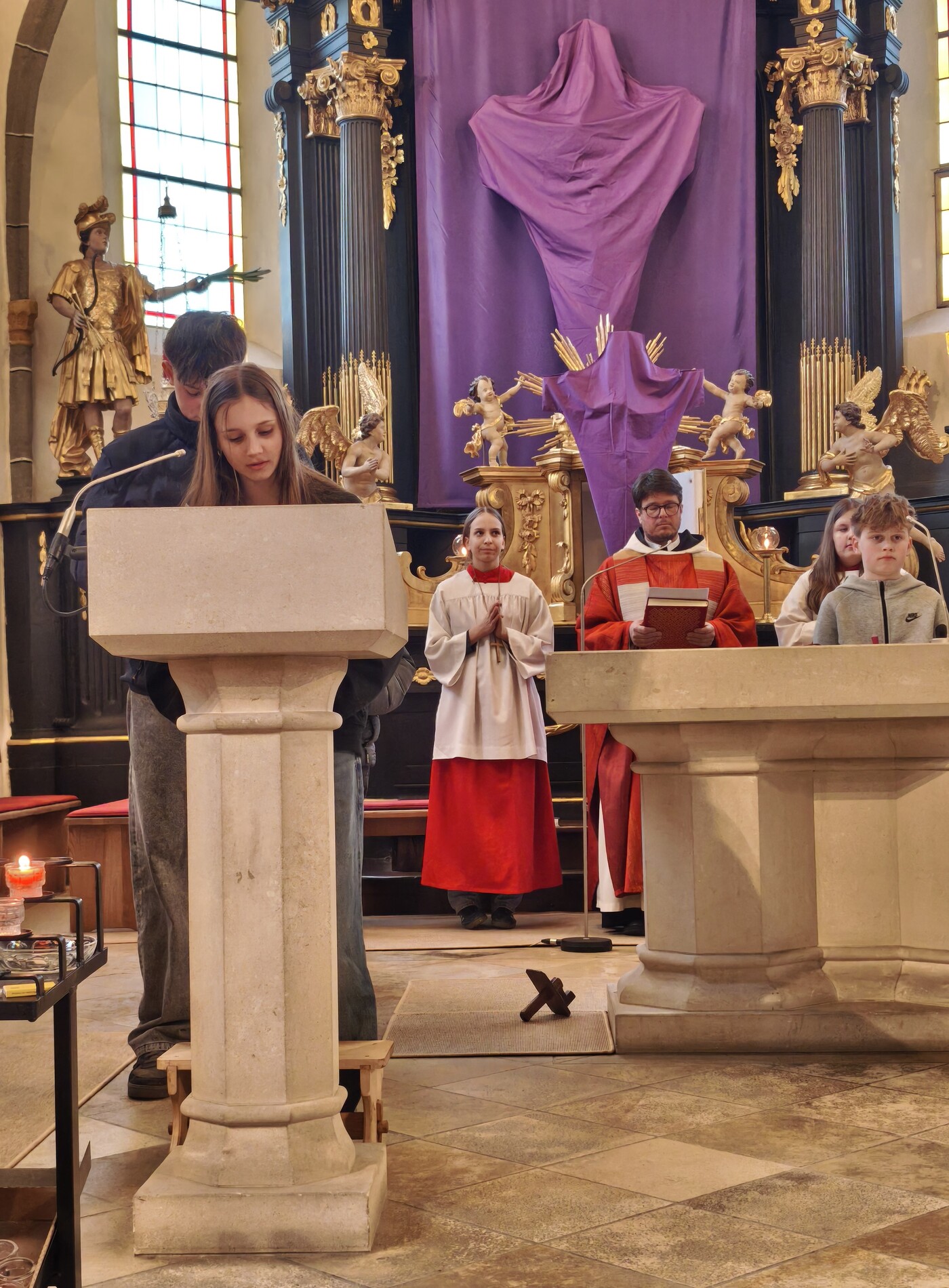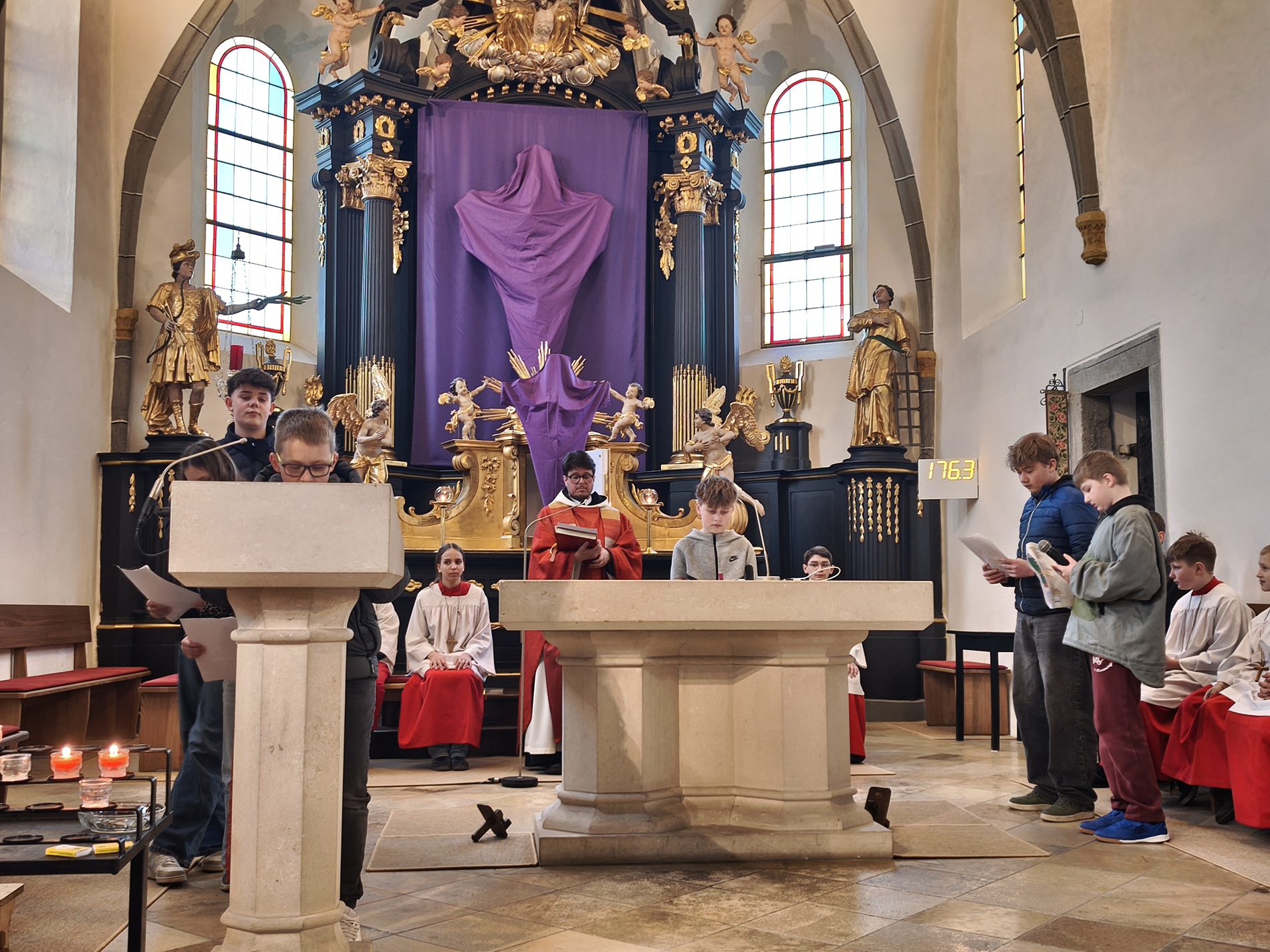 Am Karfreitag abends war P. Florian bei uns zur Feier vom Leiden und Sterben Christi, bei der die Passion wieder von einer Gruppe von Firmlingen vorgetragen wurde. Auch hier - berührend - die Liturgie mit der Leidensgeschichte, den großen Fürbitten, mit der Kreuzverehrung und der Übertragung des Kelches aus dem Tabernakel beim Hl. Grab. Entblößte Altäre, verhüllte Kreuze, kein Weihwasser, keine Licht in der Ewig-Licht-Ampel .. zeugen vom Tod Jesu am Kreuz.