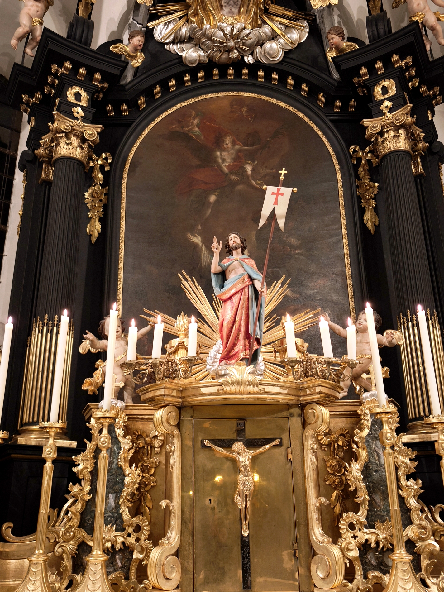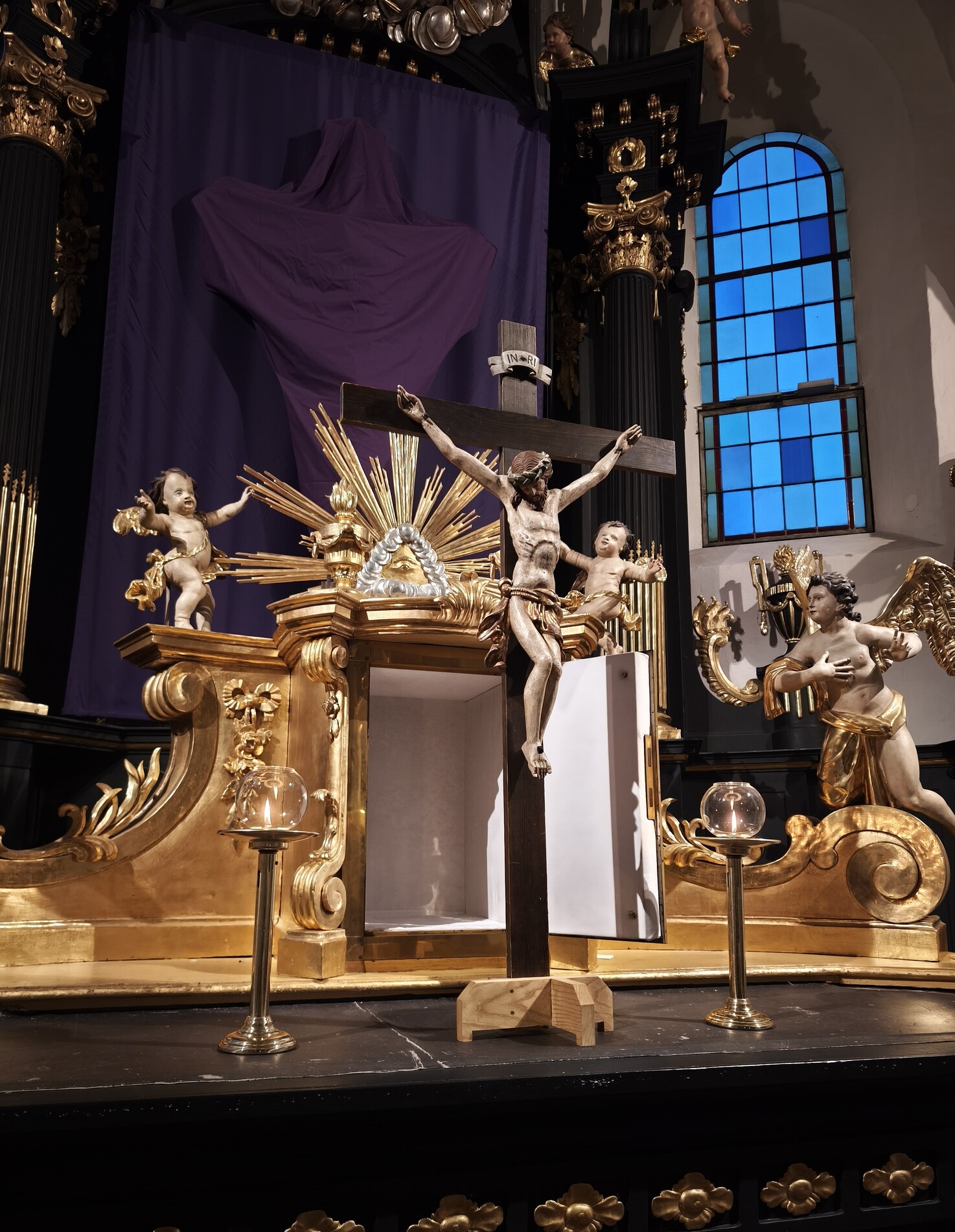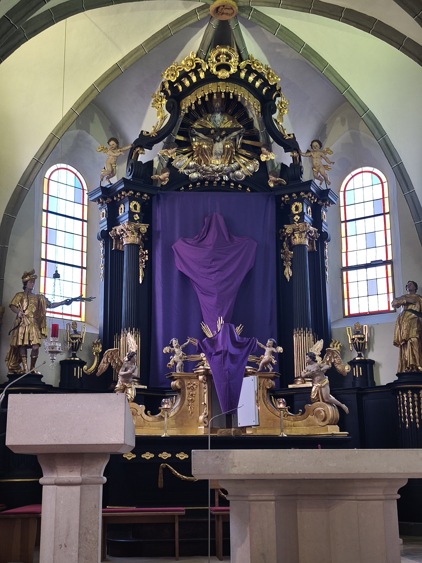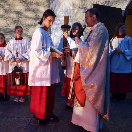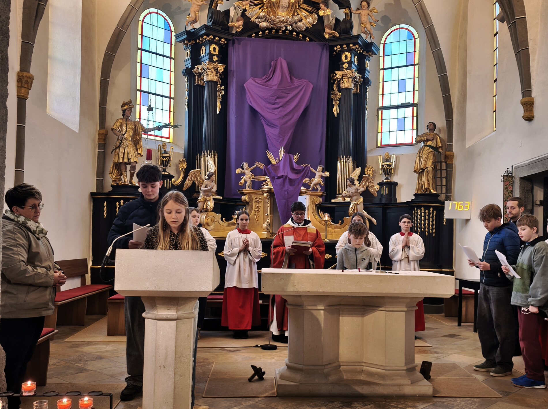 Am Karfreitag abends war P. Florian bei uns zur Feier vom Leiden und Sterben Christi, bei der die Passion wieder von einer Gruppe von Firmlingen vorgetragen wurde. Auch hier - berührend - die Liturgie mit der Leidensgeschichte, den großen Fürbitten, mit der Kreuzverehrung und der Übertragung des Kelches aus dem Tabernakel beim Hl. Grab. Entblößte Altäre, verhüllte Kreuze, kein Weihwasser, keine Licht in der Ewig-Licht-Ampel .. zeugen vom Tod Jesu am Kreuz.
