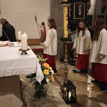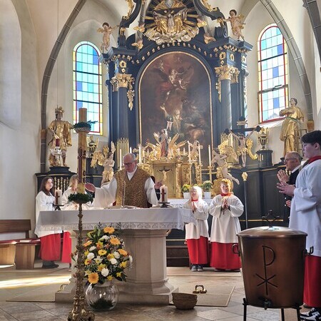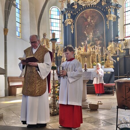 Am Ostersonntag feierten wir mit P. Aegid das Osterhochamt mit dem Kirchenchor unter der Leitung von Maria Rittmannsberger und Manfred Wagner an der Orgel. Erstmalig aufgeführt wurde die "Missa brevis in C" von Robert Jones, mit den gefälligen, kurzweiligen und zeitgenössischen Stücken beim Kyrie, Sanctus und Agnus Dei. Besonders zu erwähnen auch das wunderbare "Ave Verum" von Karl Jenkins während der Kommunion, vorgetragen von den Solistinnen Andrea Gruber und Maria Rittmannsberger.
