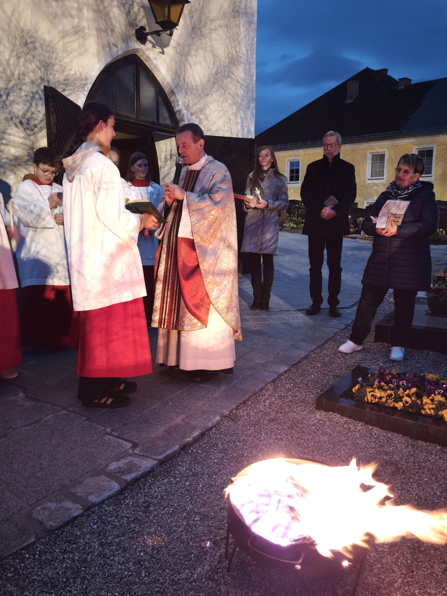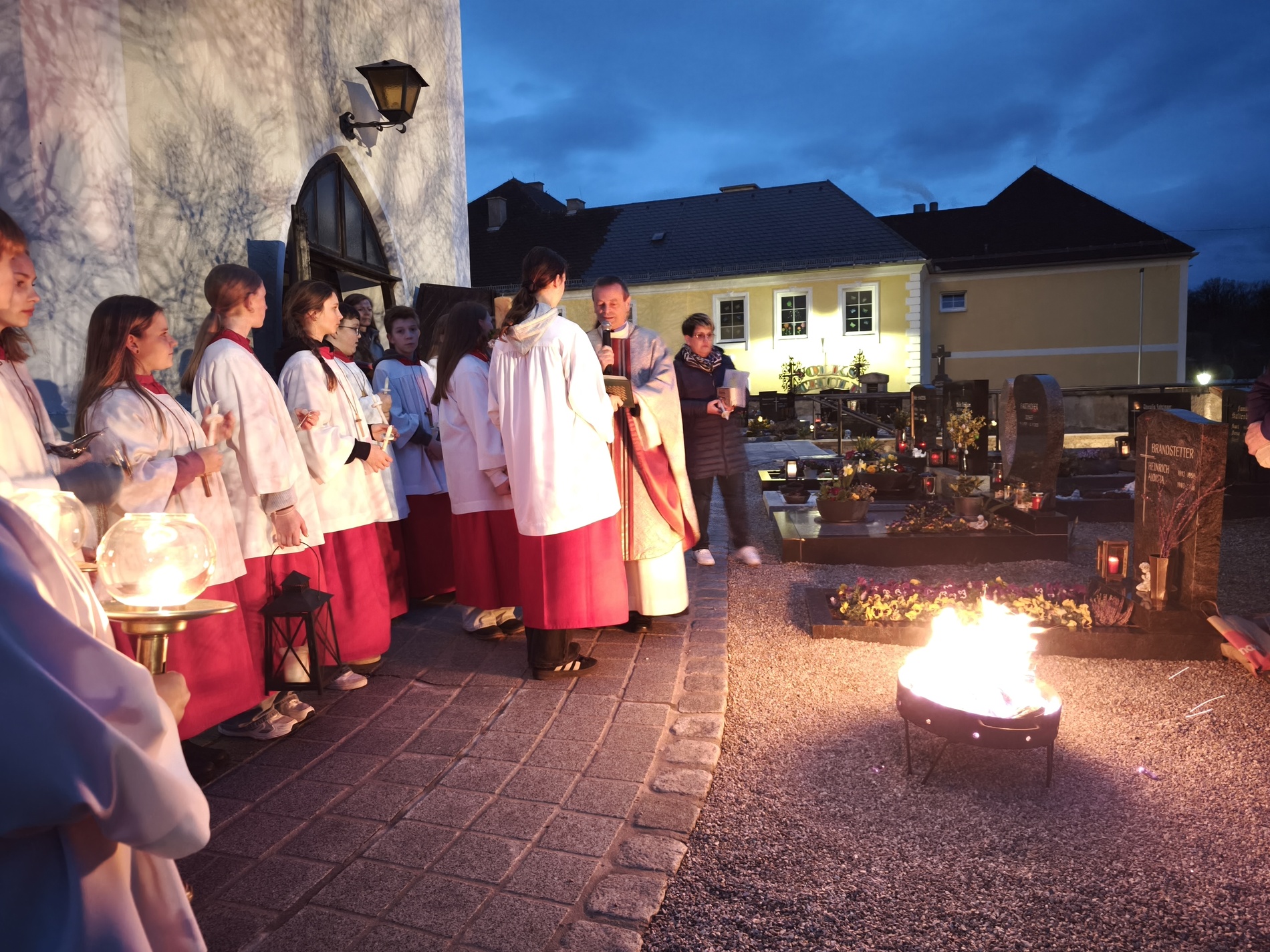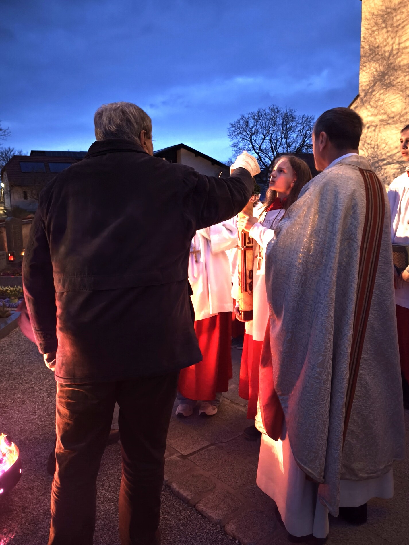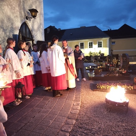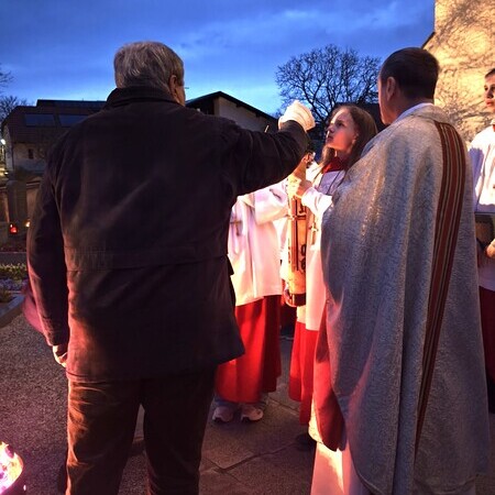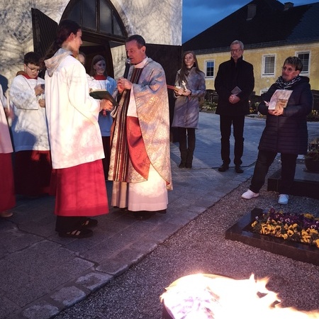 Die Osternacht - die Nacht der Nächte, wie er in seiner Predigt betonte - feierten wir mit P. Laurentius im Ritus, der seit 75 Jahren zelebriert wird: mit Segnung des Osterfeuers, Lichtfeier, Wortgottesdienst, Tauferneuerung, Taufwasserweihe und Speisensegnung.