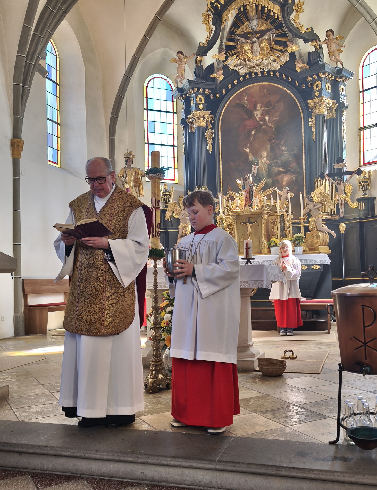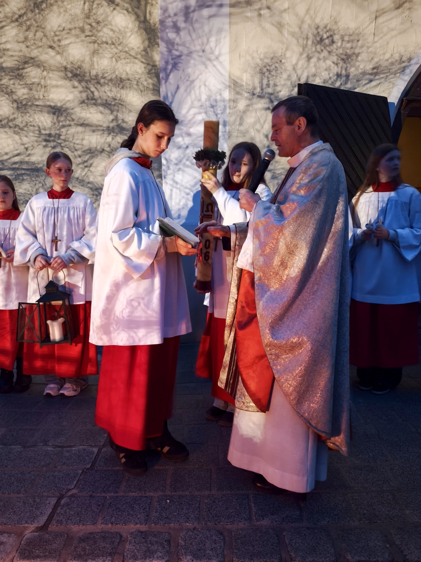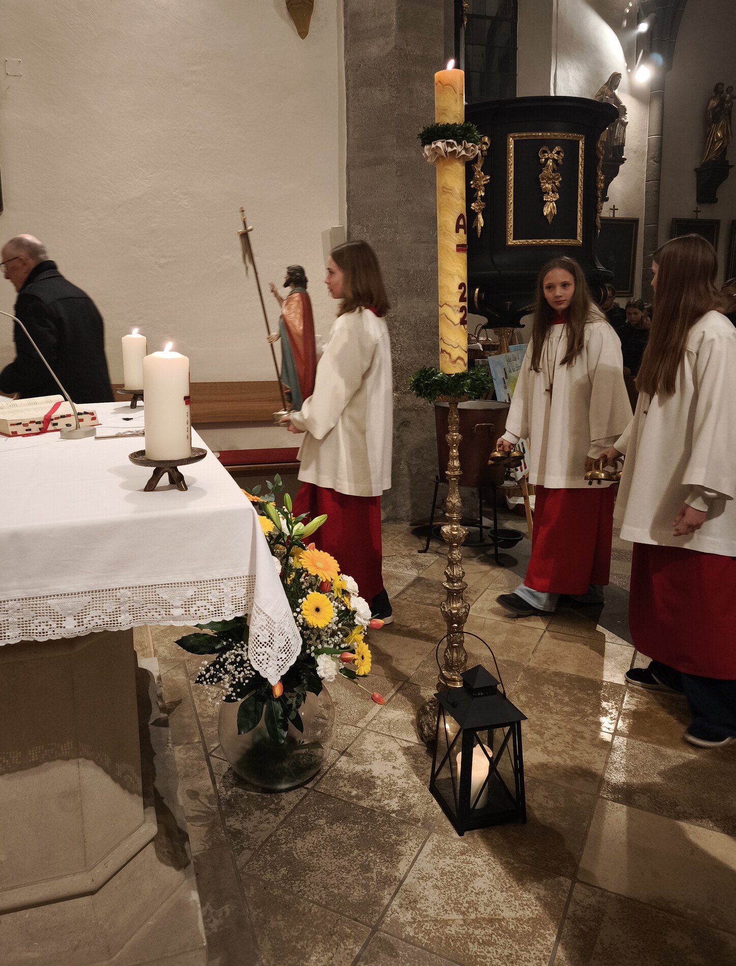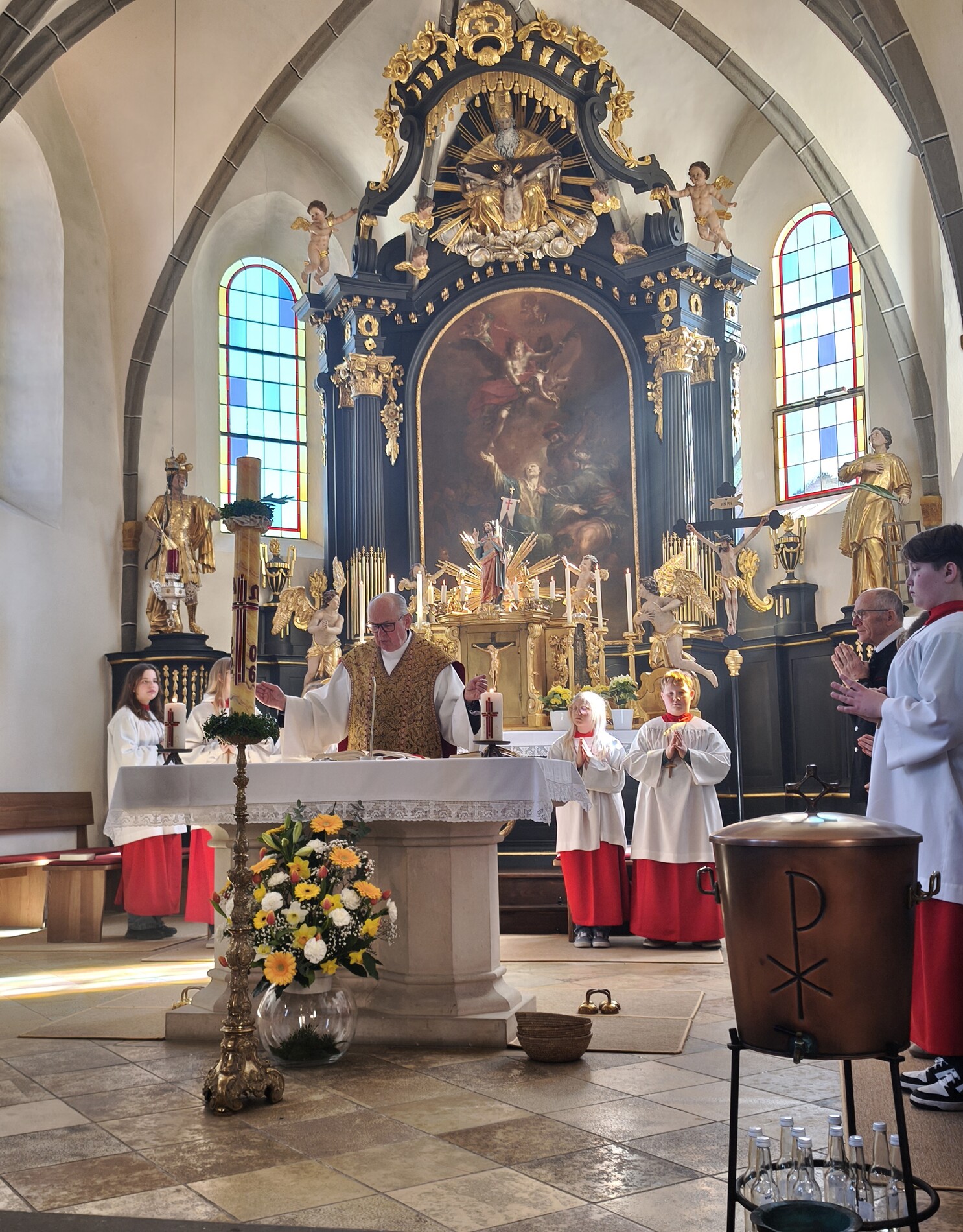 Die Osternacht - die Nacht der Nächte, wie er in seiner Predigt betonte - feierten wir mit P. Laurentius im Ritus, der seit 75 Jahren zelebriert wird: mit Segnung des Osterfeuers, Lichtfeier, Wortgottesdienst, Tauferneuerung, Taufwasserweihe und Speisensegnung.