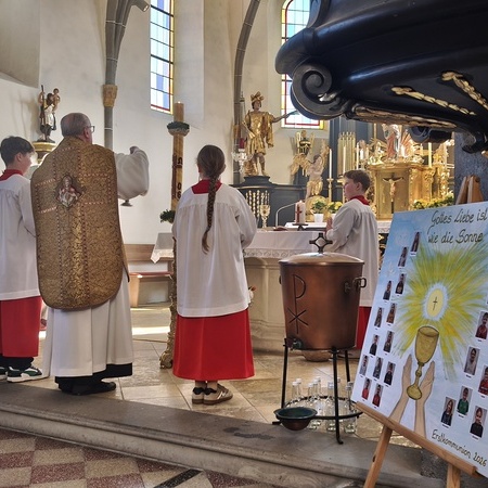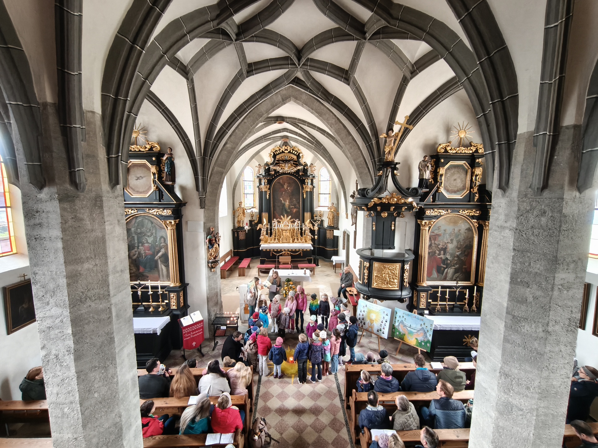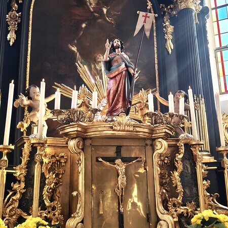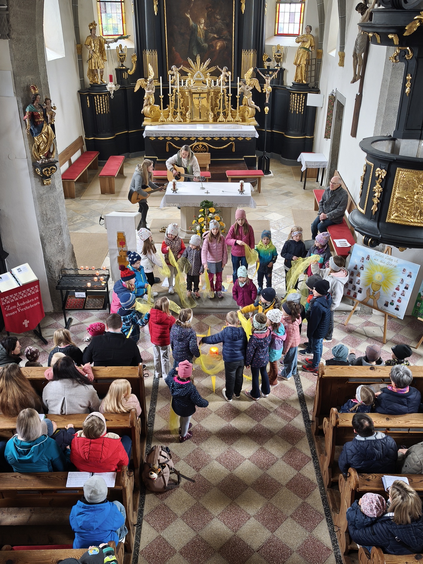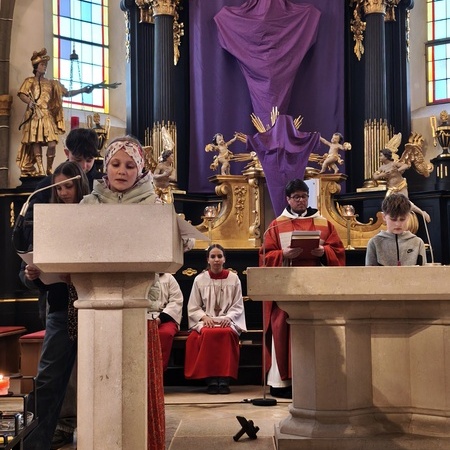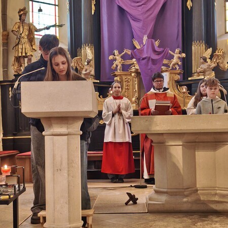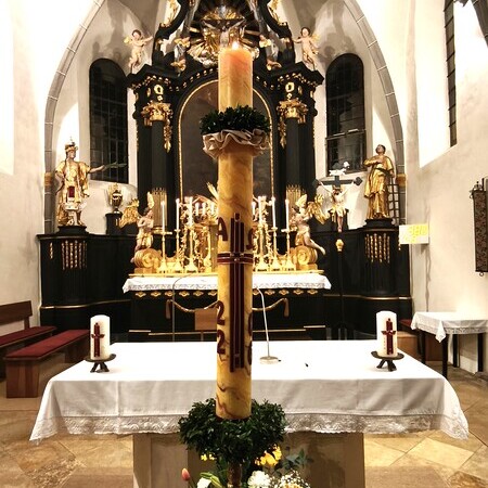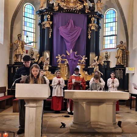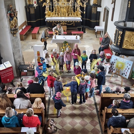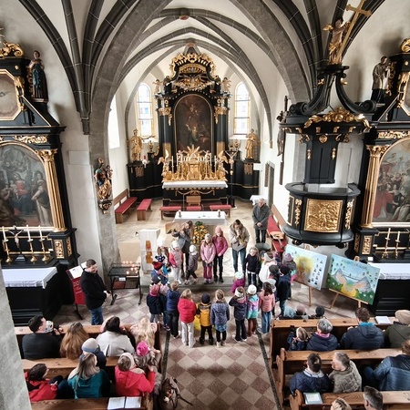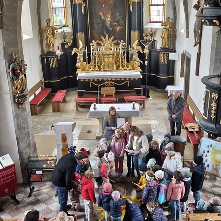 Während des Tages fanden zwei Andachten am Heiligen Grab statt, dazwischen war Zeit zum stillen Gebet. Am Nachmittag um 15 Uhr lud das Familienmessteam zur Osterandacht für Kinder ein - und ganz viele sind gekommen! Am Heiligen Grab wurde die Auferstehung Jesu anhand von Bildern erklärt und die Kinder konnten ihr Wissen einbringen. Nach einem Wechsel Richtung Altarraum legten die Kinder dann Sonnenstrahlen rund um eine Kerze und mit gelben Tüchern wurde schon das österliche Halleluja gesungen und getanzt. Danke dem Familienmessteam - diesmal Ulrike Wagner und Sarah Soxberger - für die kindgerechte Gestaltung!