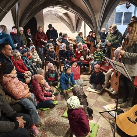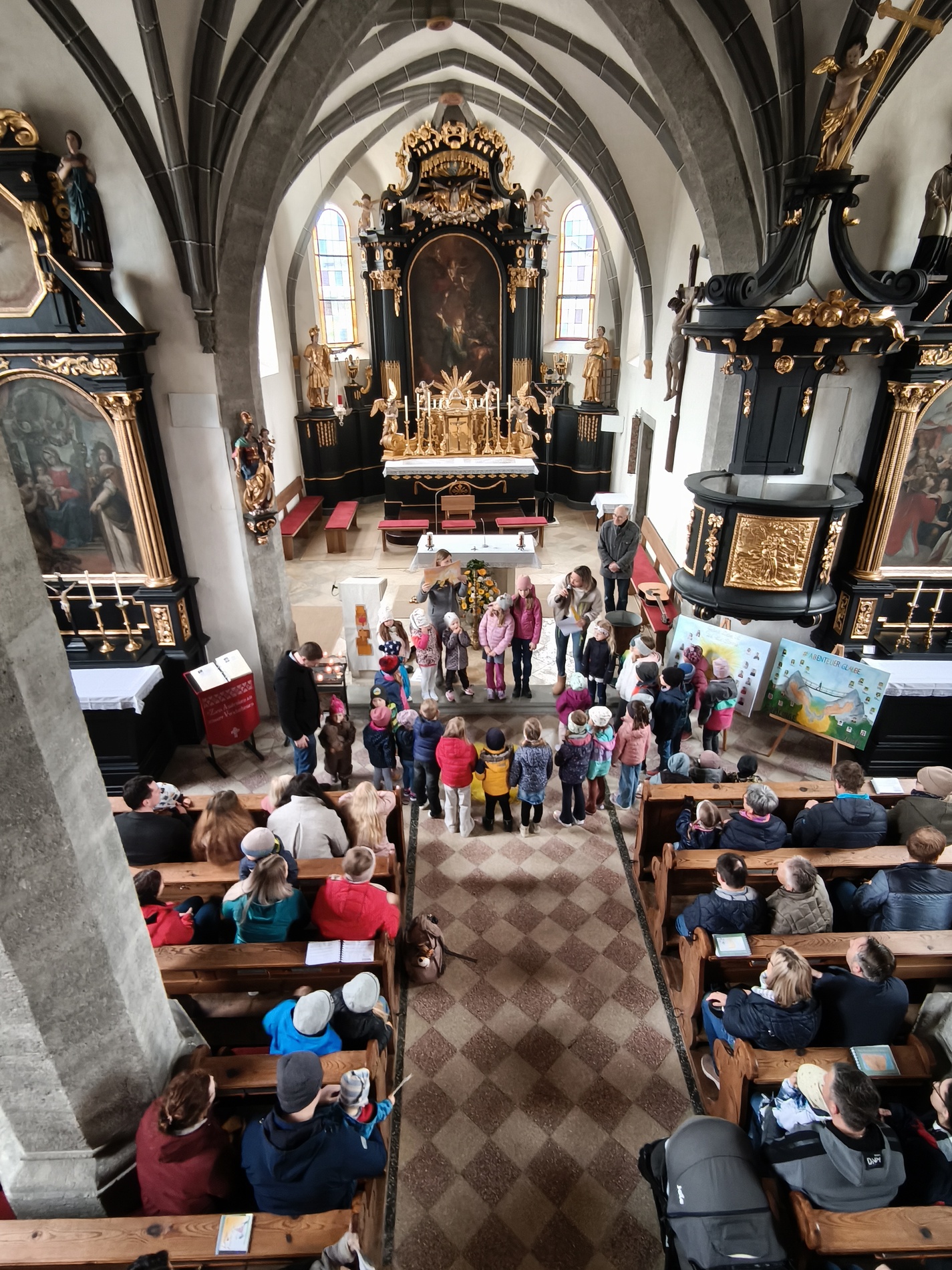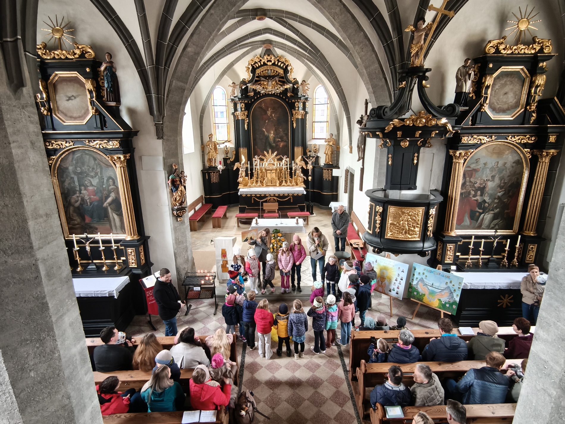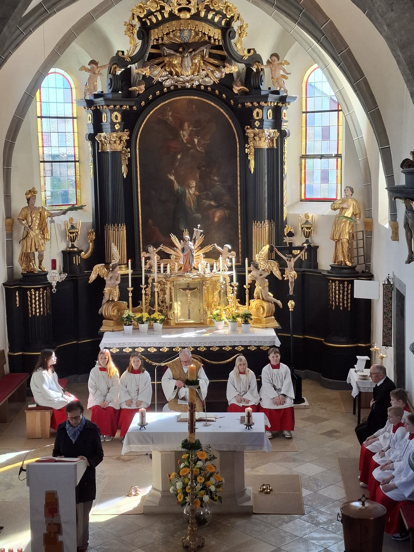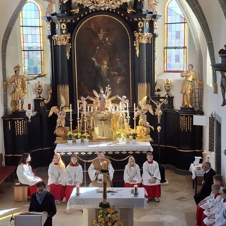 Während des Tages fanden zwei Andachten am Heiligen Grab statt, dazwischen war Zeit zum stillen Gebet. Am Nachmittag um 15 Uhr lud das Familienmessteam zur Osterandacht für Kinder ein - und ganz viele sind gekommen! Am Heiligen Grab wurde die Auferstehung Jesu anhand von Bildern erklärt und die Kinder konnten ihr Wissen einbringen. Nach einem Wechsel Richtung Altarraum legten die Kinder dann Sonnenstrahlen rund um eine Kerze und mit gelben Tüchern wurde schon das österliche Halleluja gesungen und getanzt. Danke dem Familienmessteam - diesmal Ulrike Wagner und Sarah Soxberger - für die kindgerechte Gestaltung!