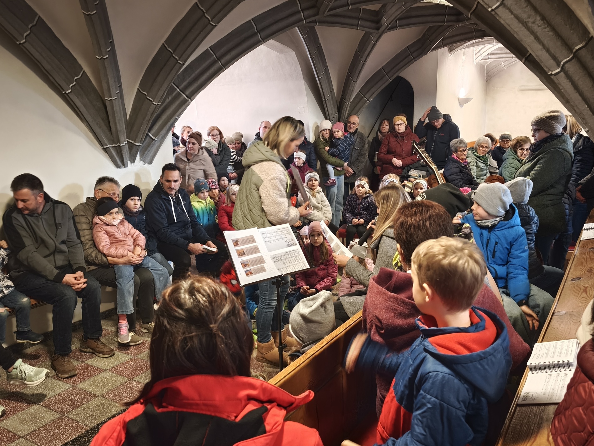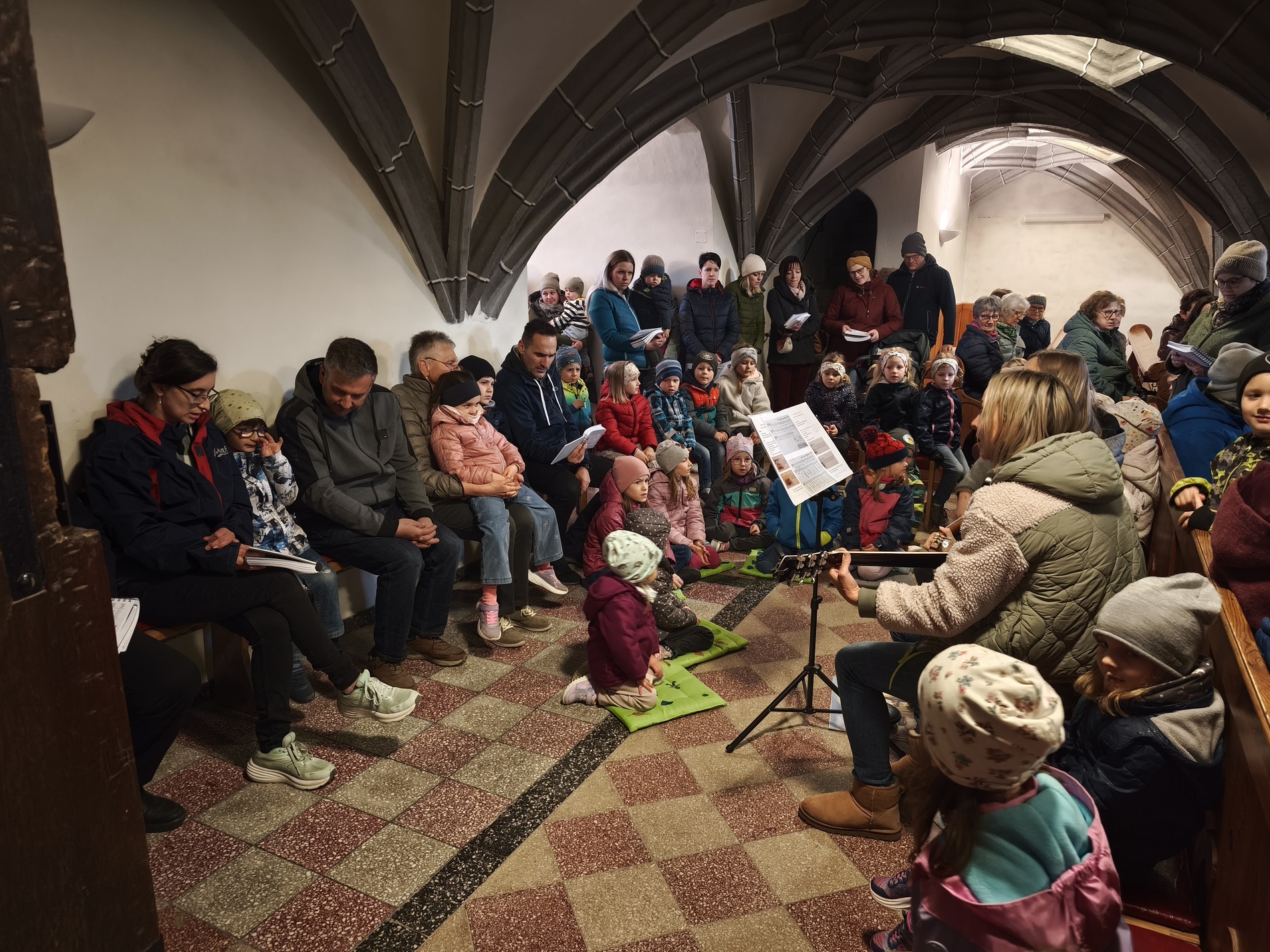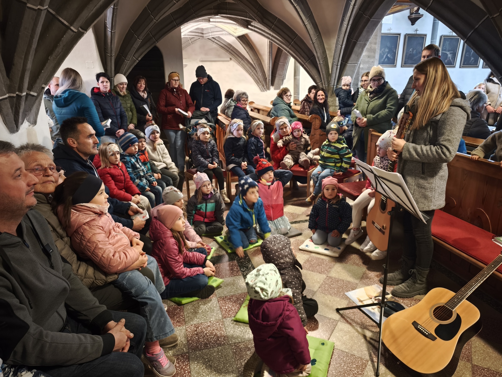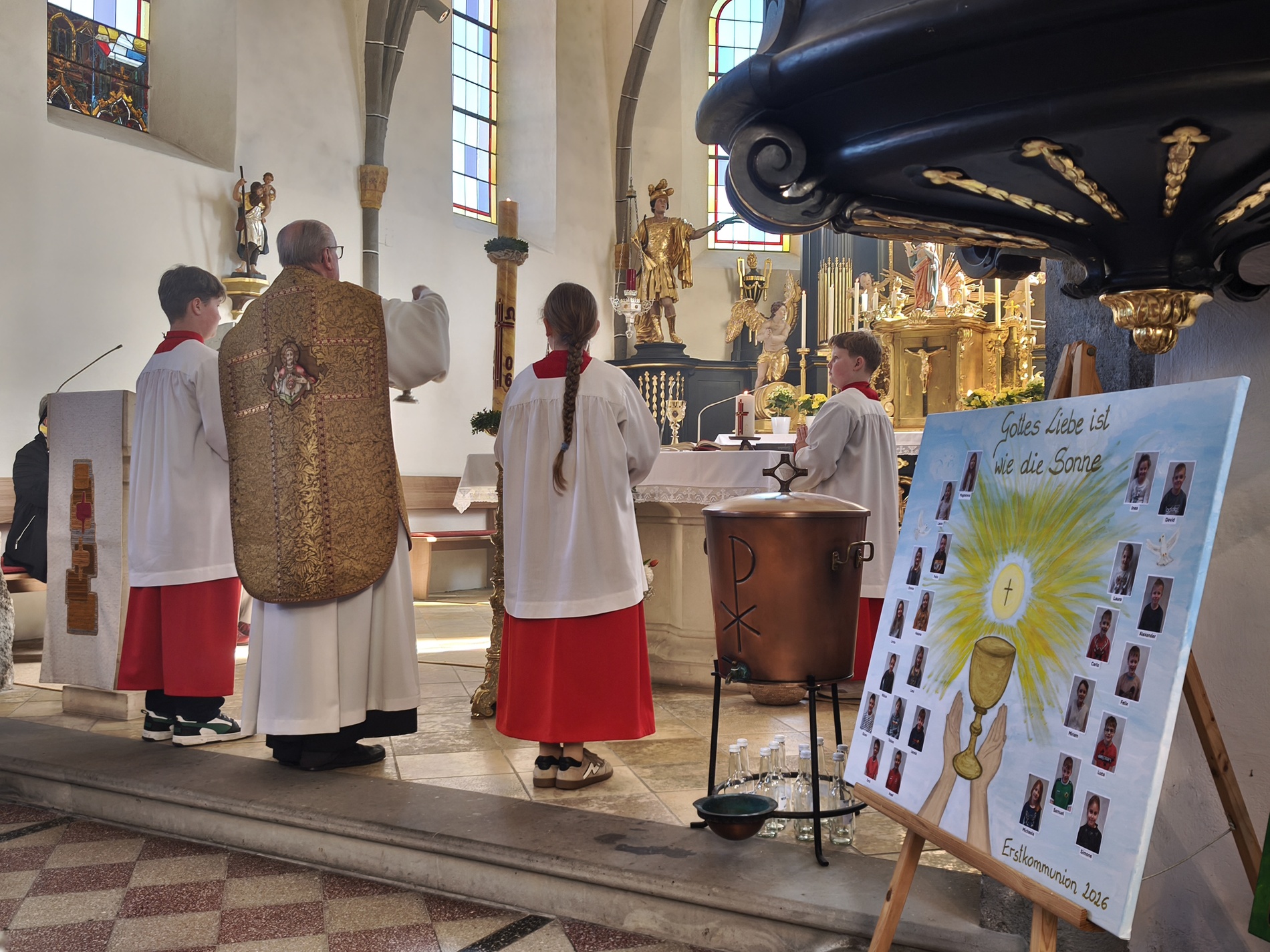 Während des Tages fanden zwei Andachten am Heiligen Grab statt, dazwischen war Zeit zum stillen Gebet. Am Nachmittag um 15 Uhr lud das Familienmessteam zur Osterandacht für Kinder ein - und ganz viele sind gekommen! Am Heiligen Grab wurde die Auferstehung Jesu anhand von Bildern erklärt und die Kinder konnten ihr Wissen einbringen. Nach einem Wechsel Richtung Altarraum legten die Kinder dann Sonnenstrahlen rund um eine Kerze und mit gelben Tüchern wurde schon das österliche Halleluja gesungen und getanzt. Danke dem Familienmessteam - diesmal Ulrike Wagner und Sarah Soxberger - für die kindgerechte Gestaltung!