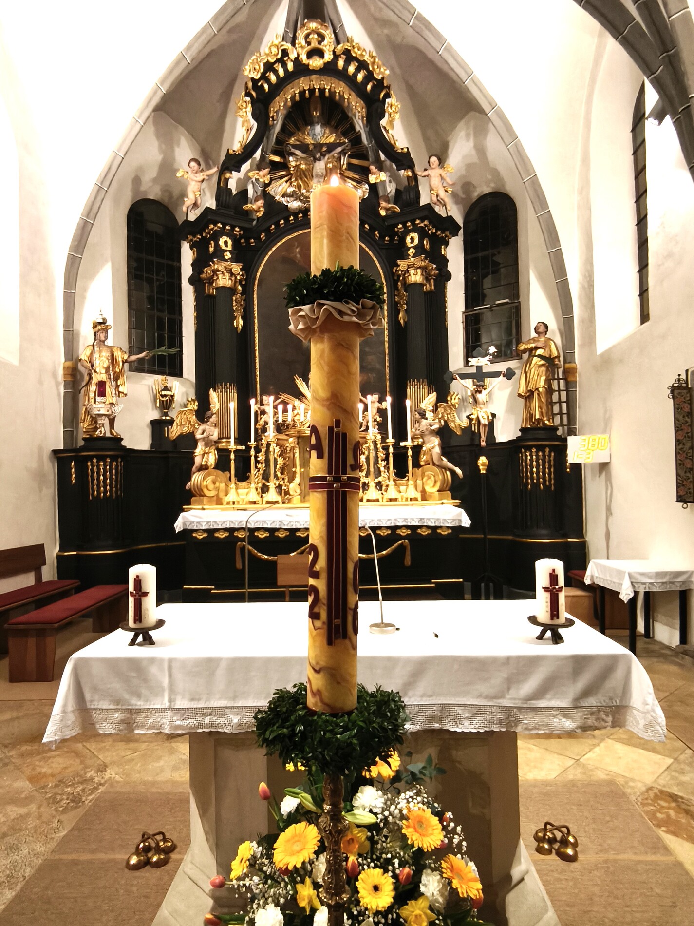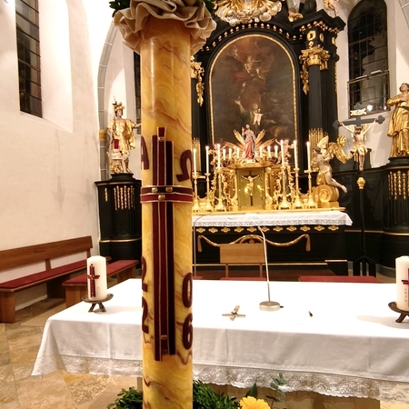 Heuer hat P. Florian eine wunderschöne Bienenwachskerze als Osterkerze ausgesucht, die wieder von Renate Hinterleitner verziert wurde - eine Zierde für unsere Kirche!