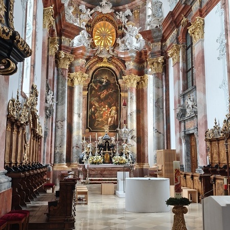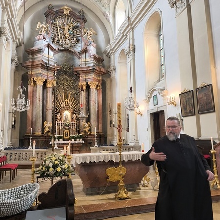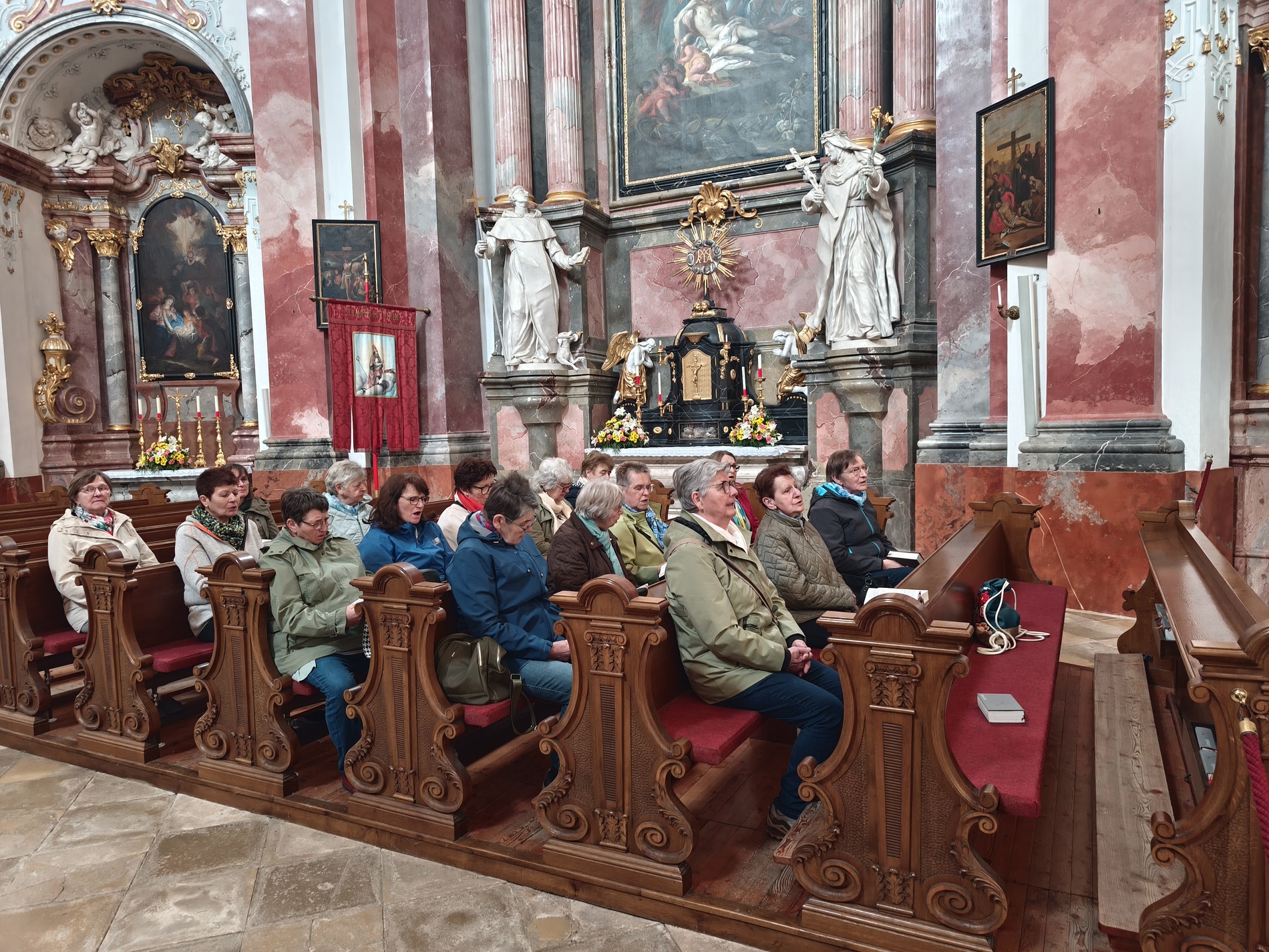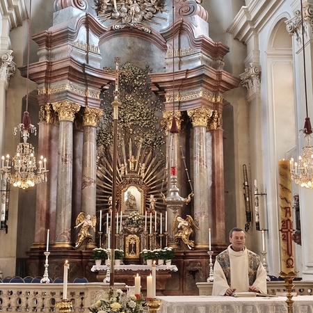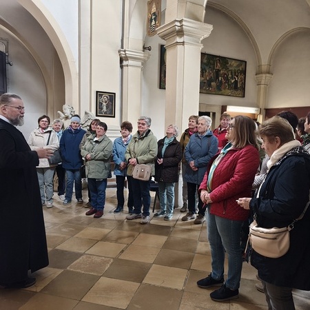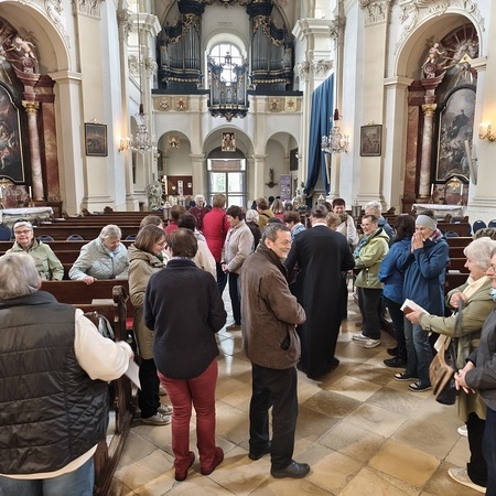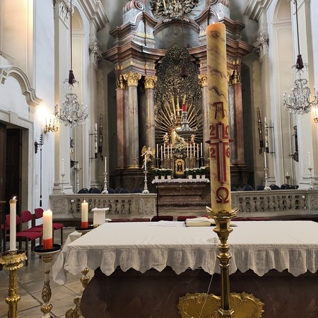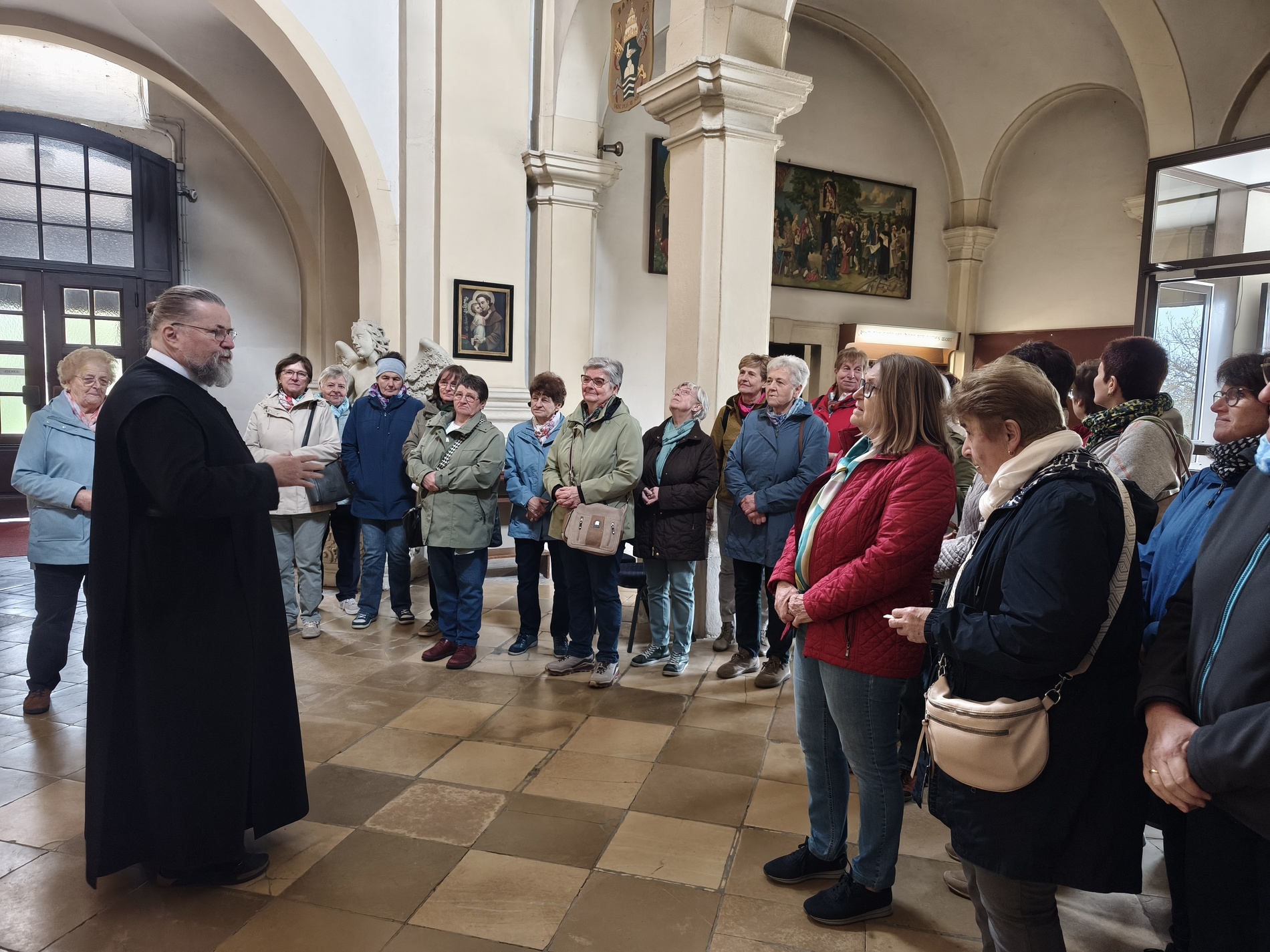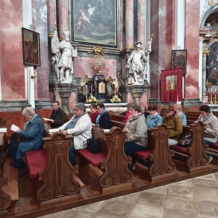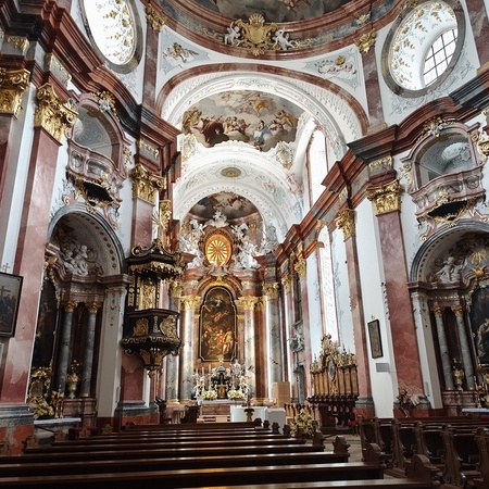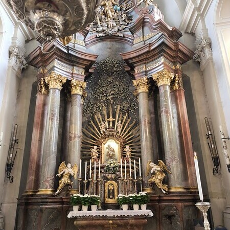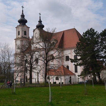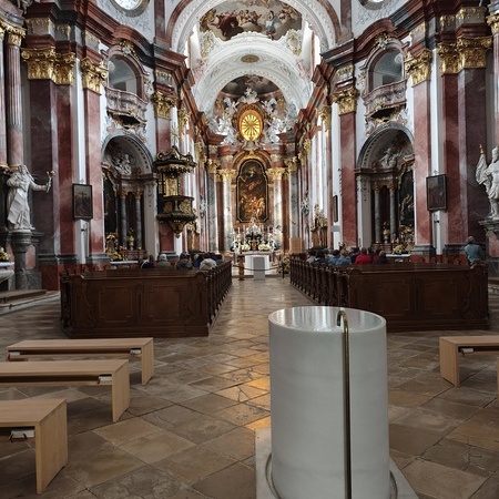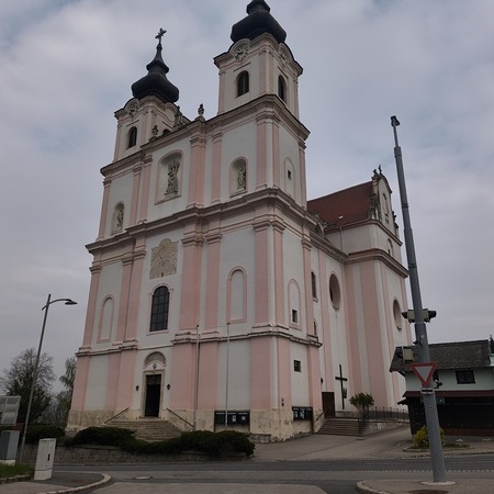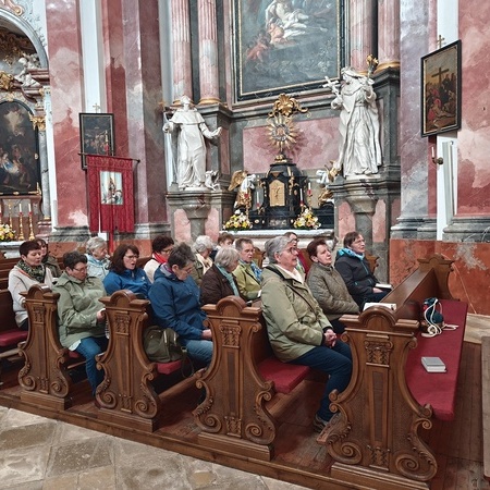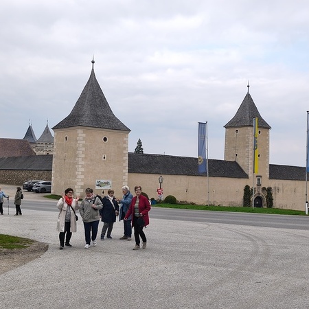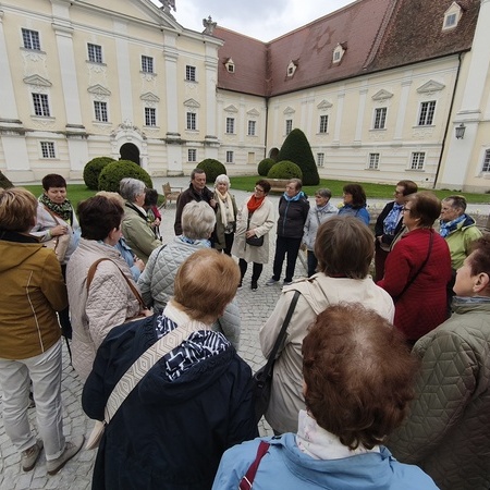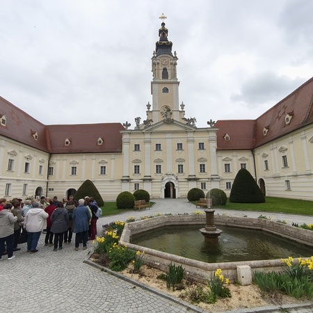 Das erste Ziel war die Wallfahrtskirche Maria Dreieichen. Dort begrüßte uns der Prior des Stiftes Altenburg und Pfarrer von Maria Dreieichen P. Michael Hüttl und führte uns sehr informativ und launig durch die Basilika minor. Anschließend feierte P. Laurentius mit uns die Hl. Messe. In Maria Dreieichen konnten wir noch die Graselhöhle und die Bründlkapelle sehen.