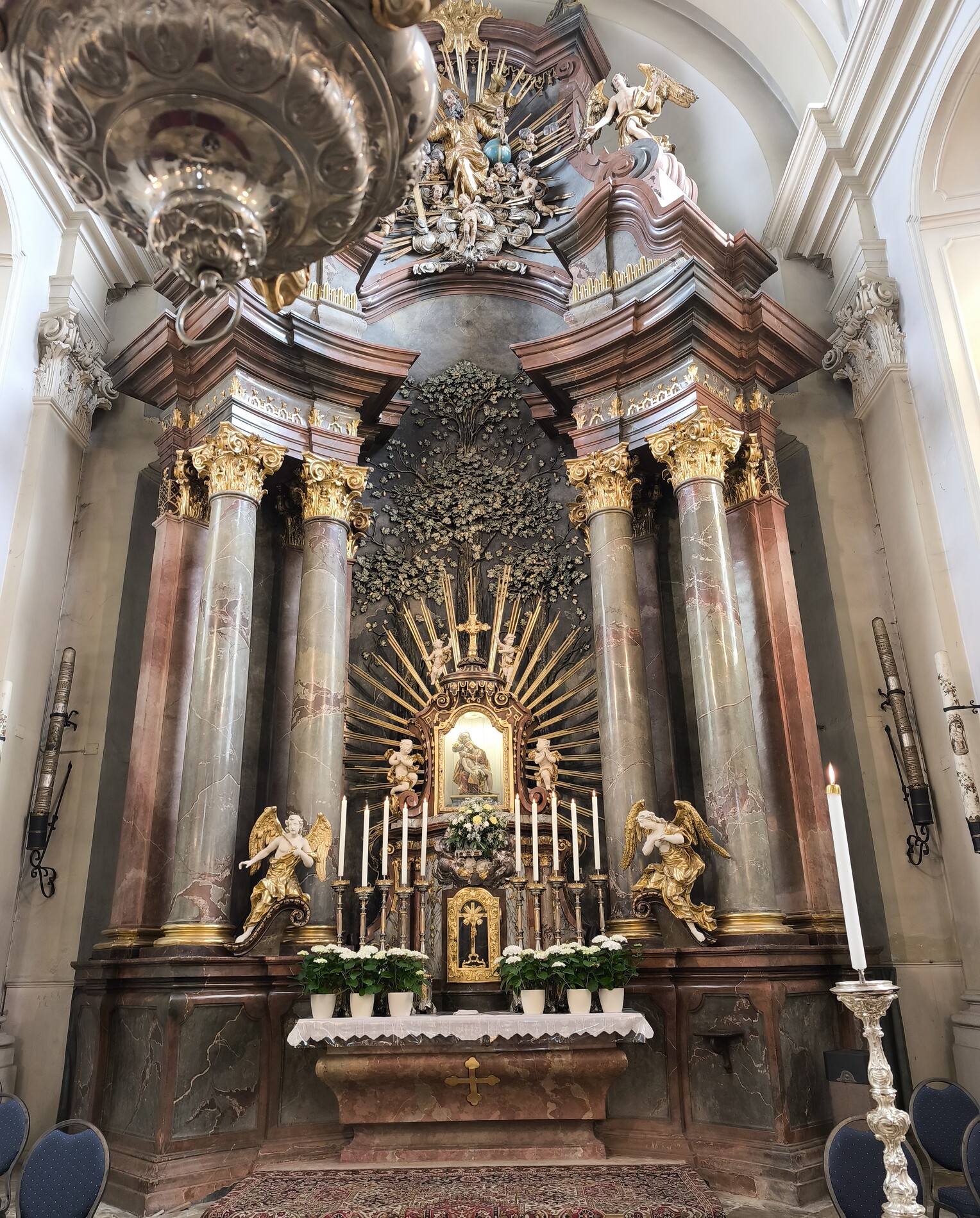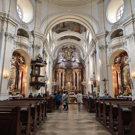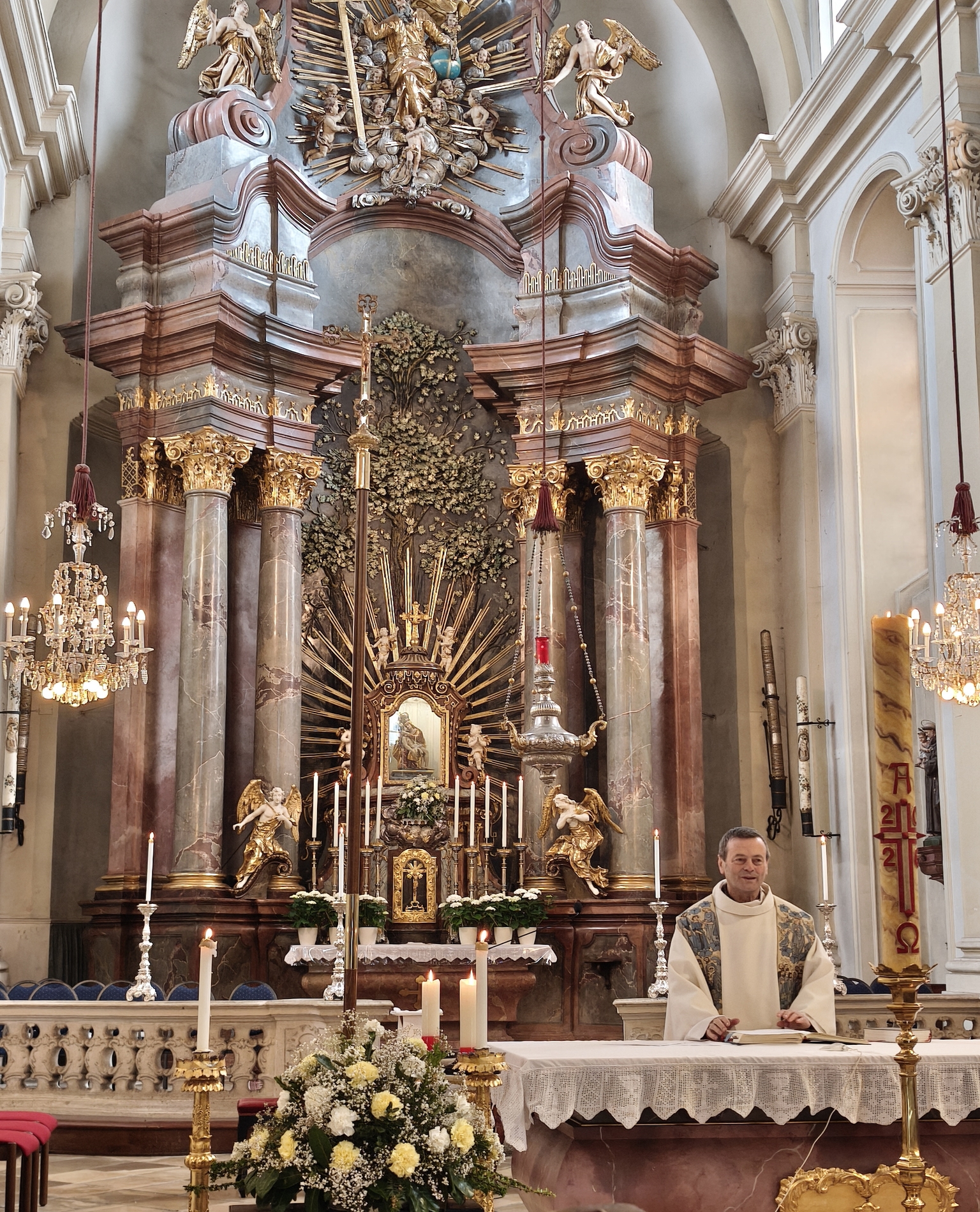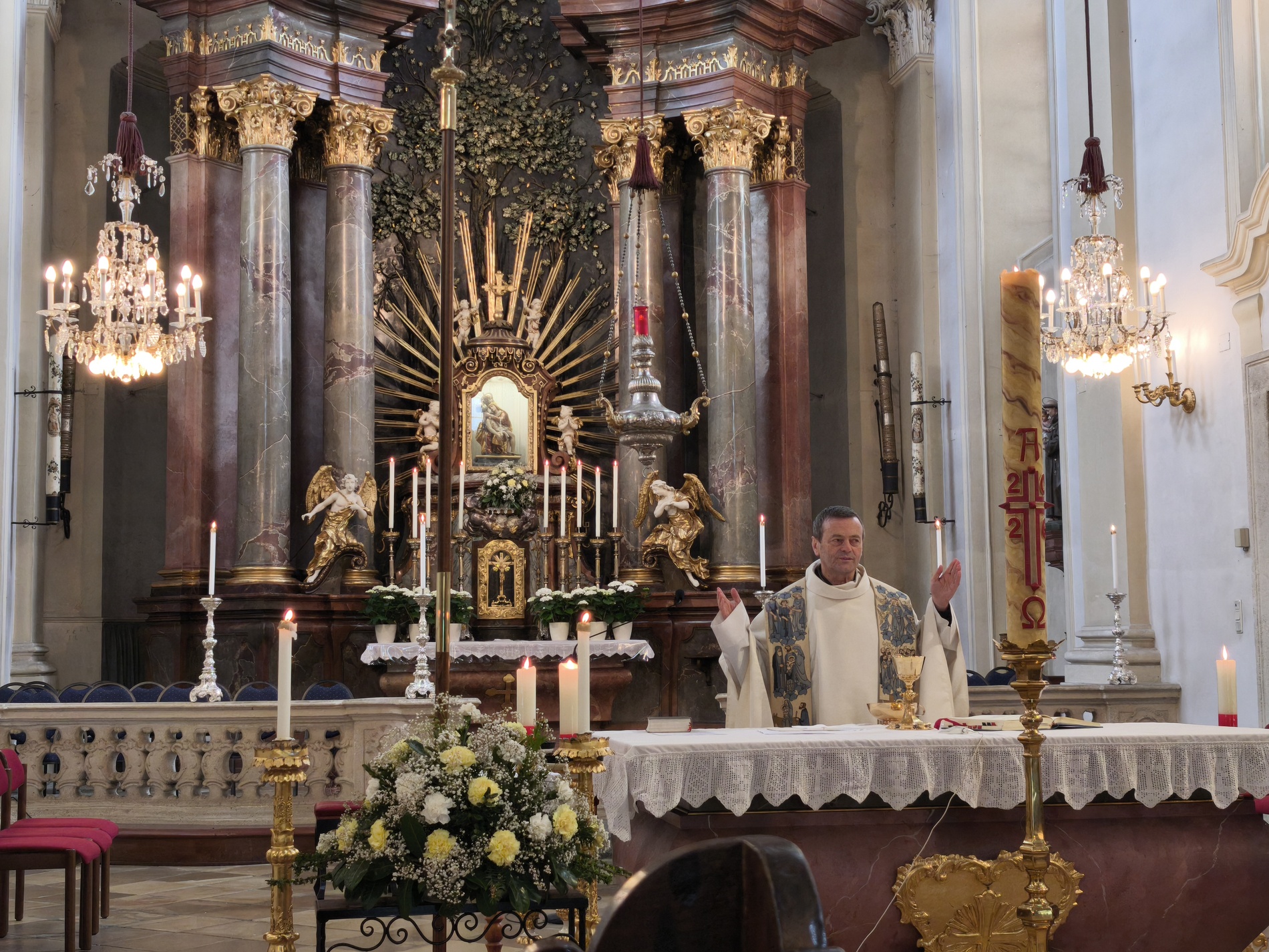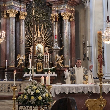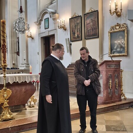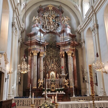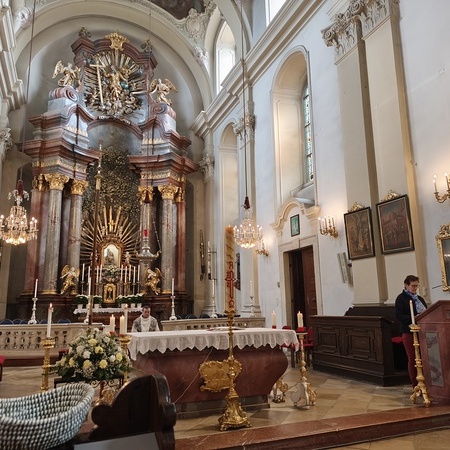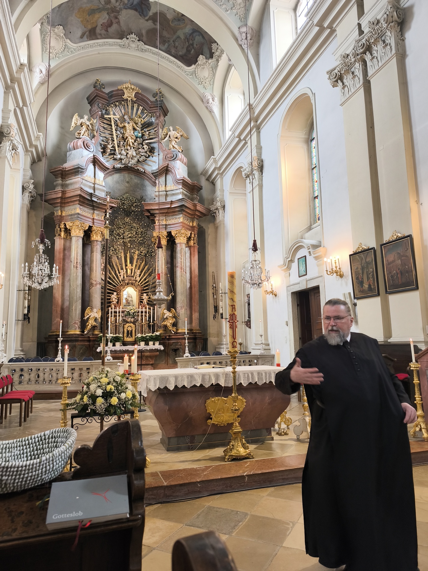 Das erste Ziel war die Wallfahrtskirche Maria Dreieichen. Dort begrüßte uns der Prior des Stiftes Altenburg und Pfarrer von Maria Dreieichen P. Michael Hüttl und führte uns sehr informativ und launig durch die Basilika minor. Anschließend feierte P. Laurentius mit uns die Hl. Messe. In Maria Dreieichen konnten wir noch die Graselhöhle und die Bründlkapelle sehen.