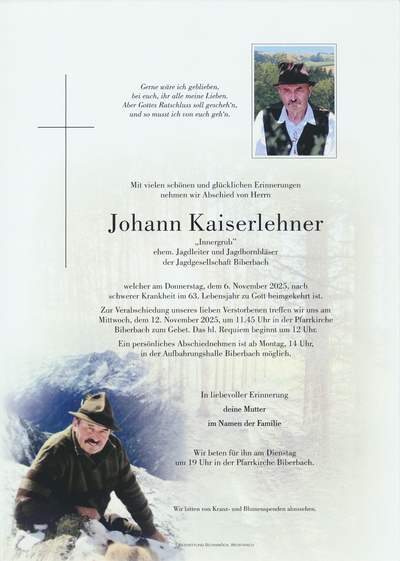 15)Johann Kaiserlehner, + am 6. November im 63. Lebensjahr