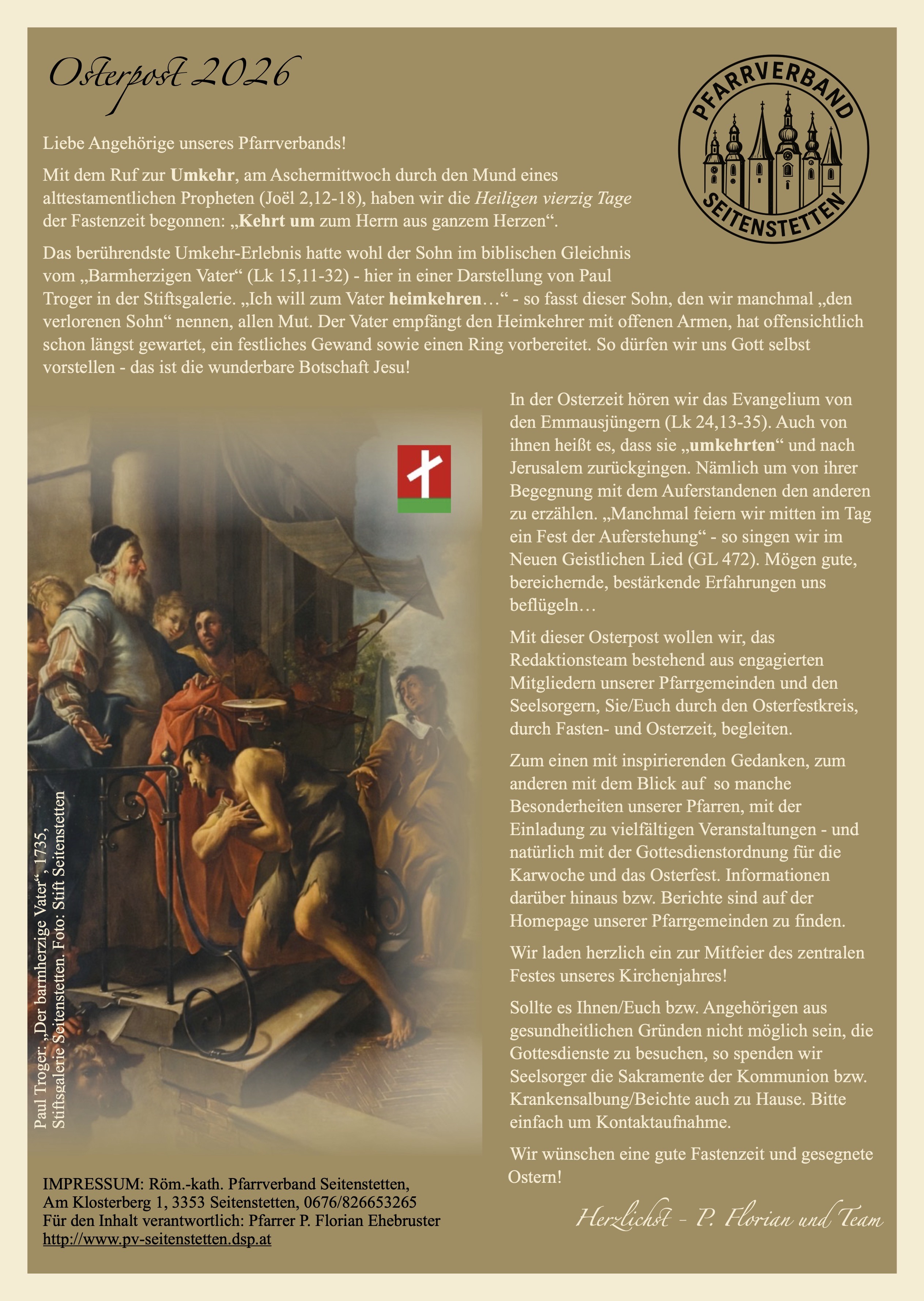 Das neue Pfarrverbandsblatt ist fertig und wird in den kommenden Tagen verteilt bzw. per Post verschickt. Sollten Sie keines bekommen haben, so liegen in allen Pfarrkirchen Exemplare auf. Hier kann die Osterpost auch online gelesen werden...